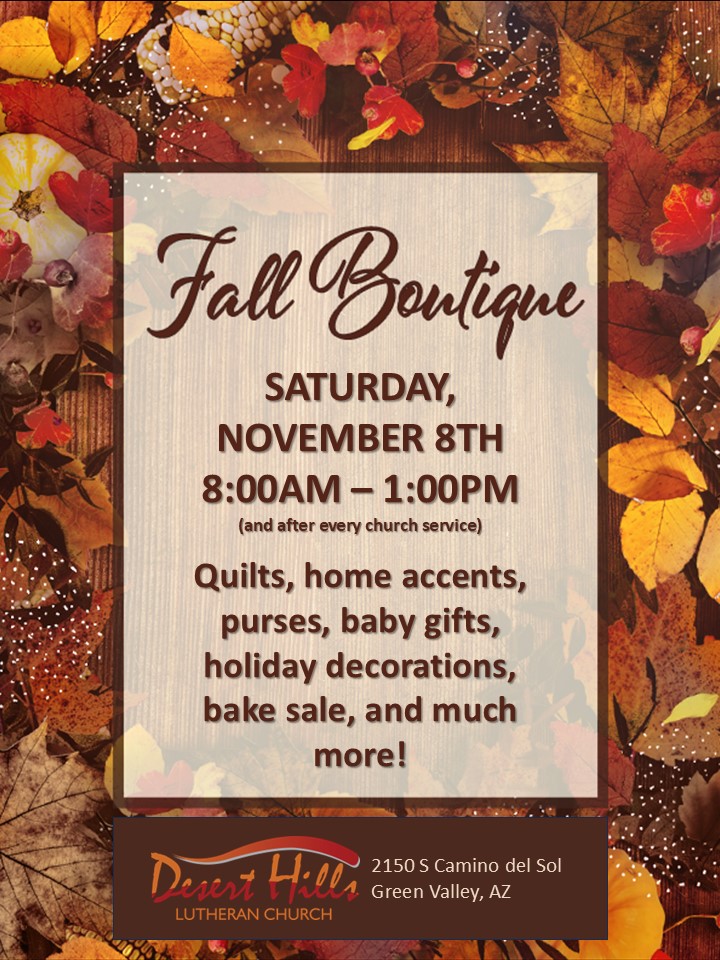 Sewing Bee’s annual Fall Boutique featuring handmade jewelry, home décor, purses, kitchen items, gently read books, baked goods, and, of course, quilts will be Saturday, November 8, from 8 am - 1 pm at Desert Hills Lutheran Church. You will not want to miss this chance to purchase unique gifts for those on your holiday shopping list. All proceeds support benevolent giving to area charities. In addition, the women's ministry will have a bake sale. So pick up a few sweets for all the downtime you will experience after finishing your Christmas shopping at the Fall Boutique. Cash, check, and credit cards are accepted for boutique purchases. We hope to see you there.