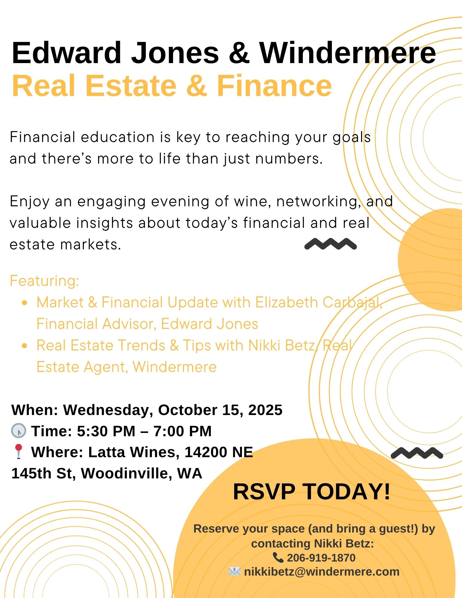 I’d love for you to join us for a fun and relaxed evening at Latta Wines in Woodinville. It’s a chance to connect, sip some great wine, and share updates that might be helpful for you and your future plans.