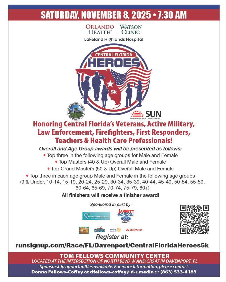 Registration is NOW OPEN for the 2025 Central Florida Heroes 5K, presented by Orlando Health and hosted by the City of Davenport and Four Corners Sun!