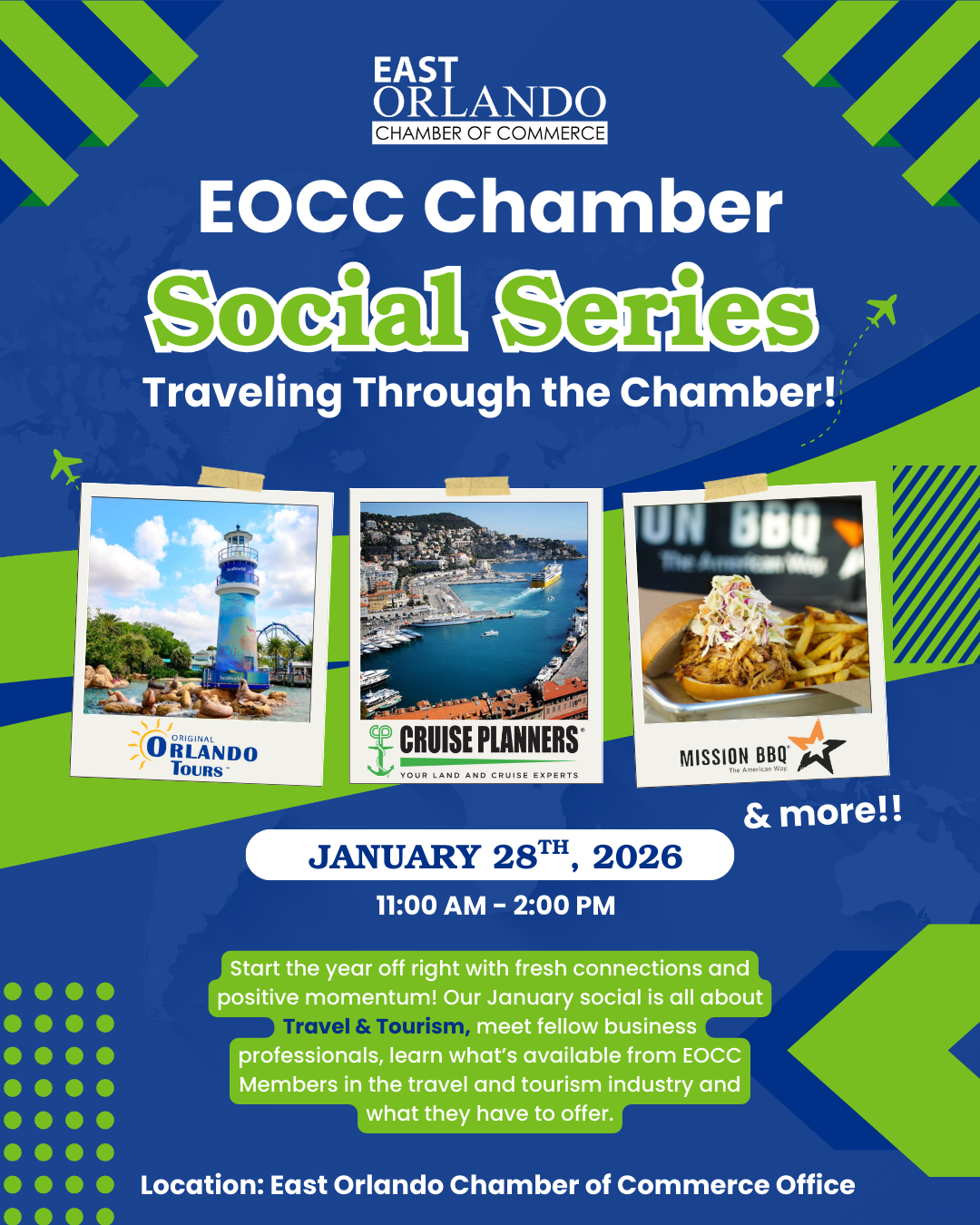 Traveling Through the Chamber Start the year off right with fresh connections and positive momentum! Our January social is all about Travel & Tourism, meet fellow business professionals, learn what’s available from EOCC Members in the travel and tourism industry and what they have to offer. Attendees will also get to meet fellow professionals, learn what’s ahead for the Chamber in 2026. Discover how to make the most your membership as we toast to Traveling through the Chamber planning for a great year ahead.