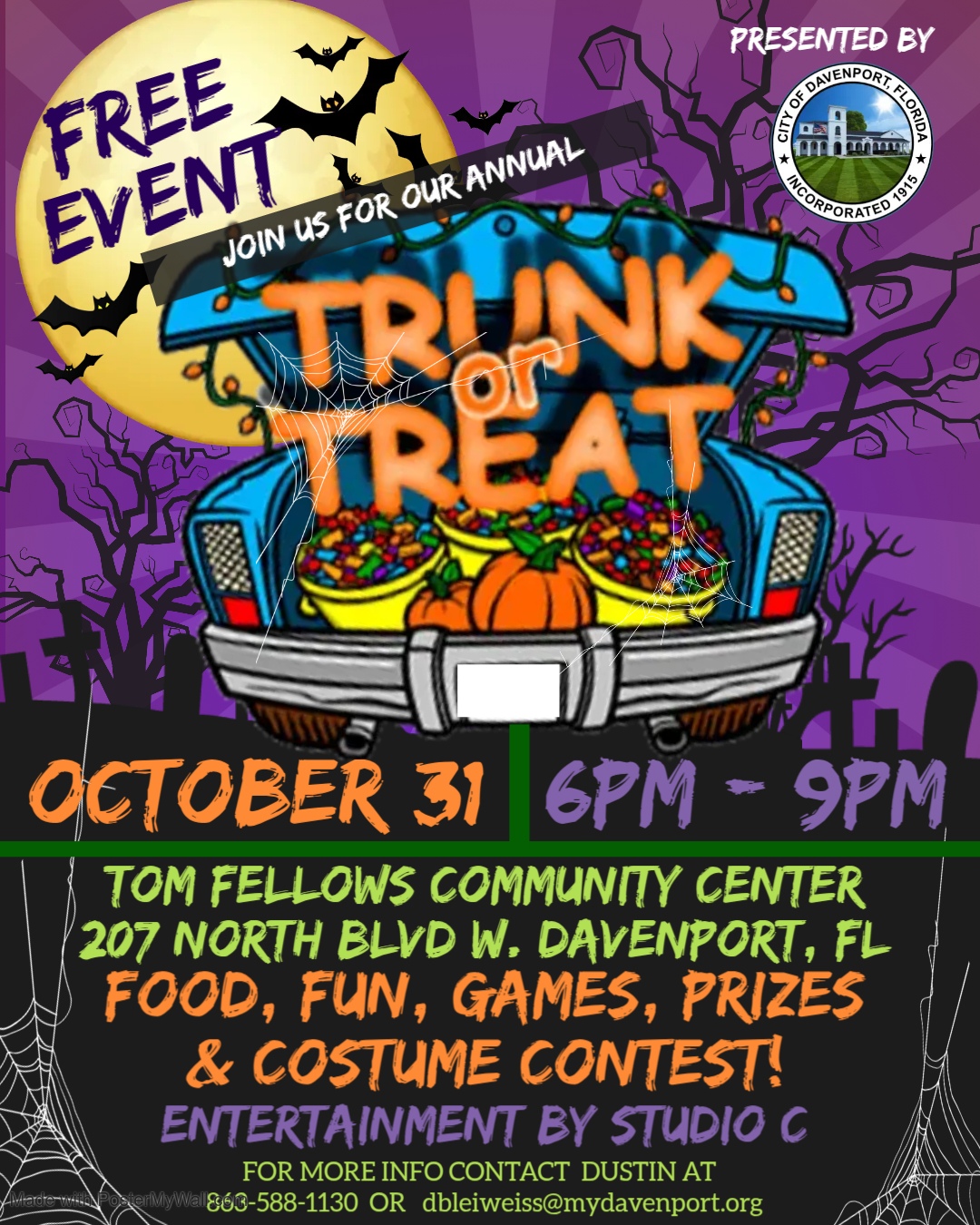 City of Davenport's Annual Trunk or Treat! Friday, October 31st, 6 - 9 p.m., Tom Fellows Community Center, 207 North Blvd. West, Davenport, FL. Food, Fun, Games, Prizes, & Costume Contest! Entertainment by Studio C. For more info contact Dustin at 863-588-1130 or dbleiweiss@mydavenport.org. Click HERE for the flyer.