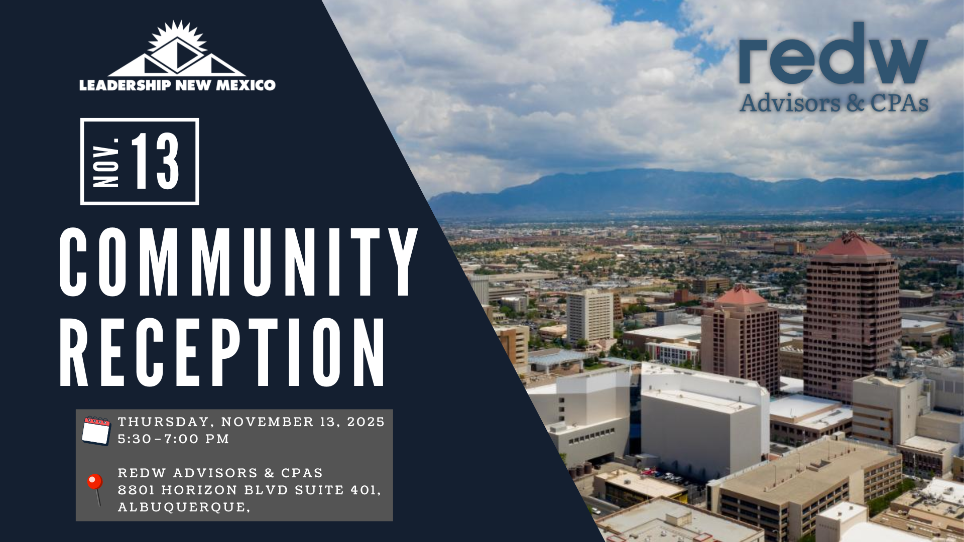Join Leadership New Mexico for an evening of networking, connection, and community building! Our Albuquerque Community Reception is an opportunity to meet fellow leaders, alumni, and friends who are shaping the future of New Mexico.