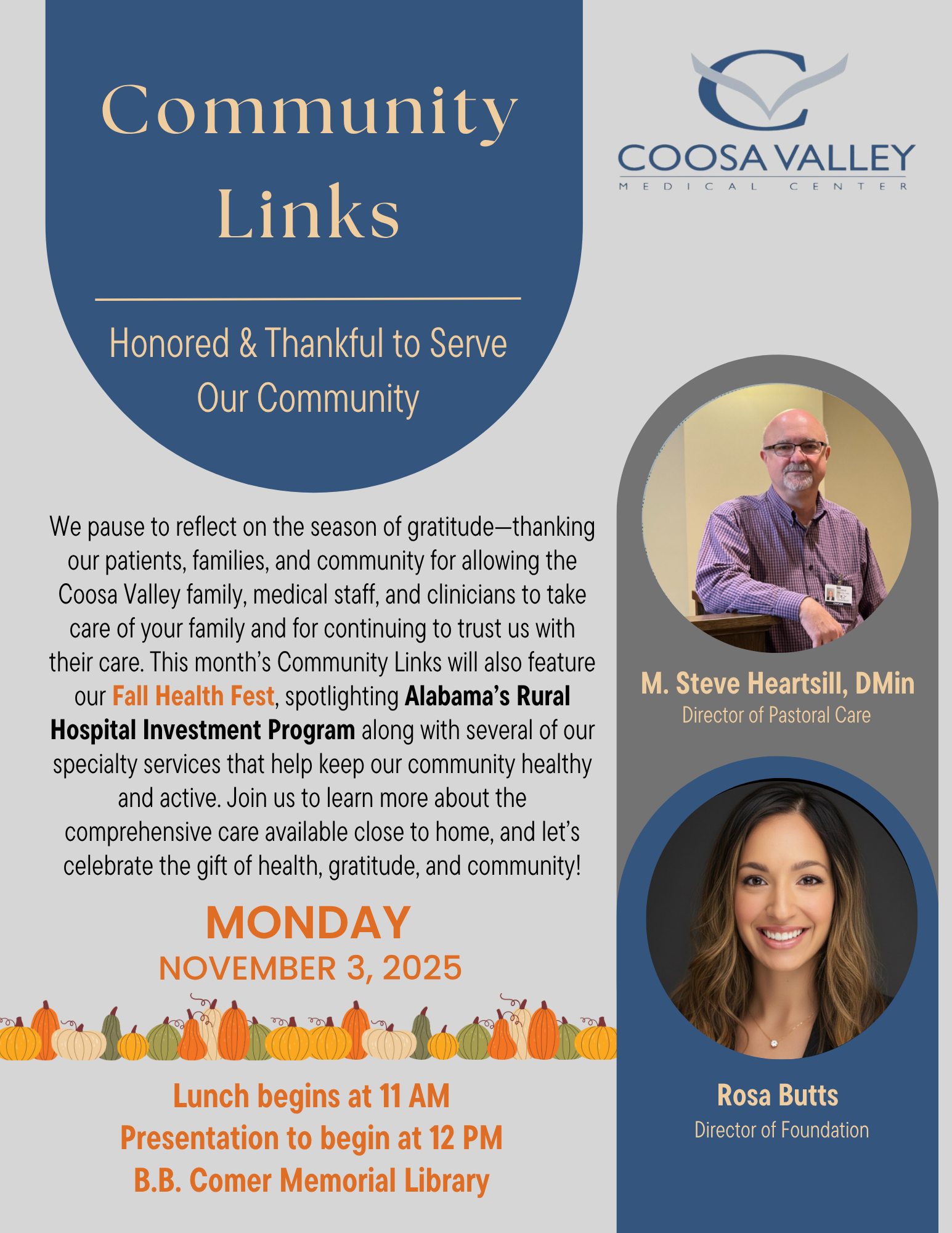 As we move into a season of gratitude, we’re reminded of how thankful we are for the trust our community places in us. Each day, the Coosa Valley Medical Center team is honored to care for you, your families, and your loved ones, and we can’t wait to celebrate that spirit of togetherness at our next Community Links event!