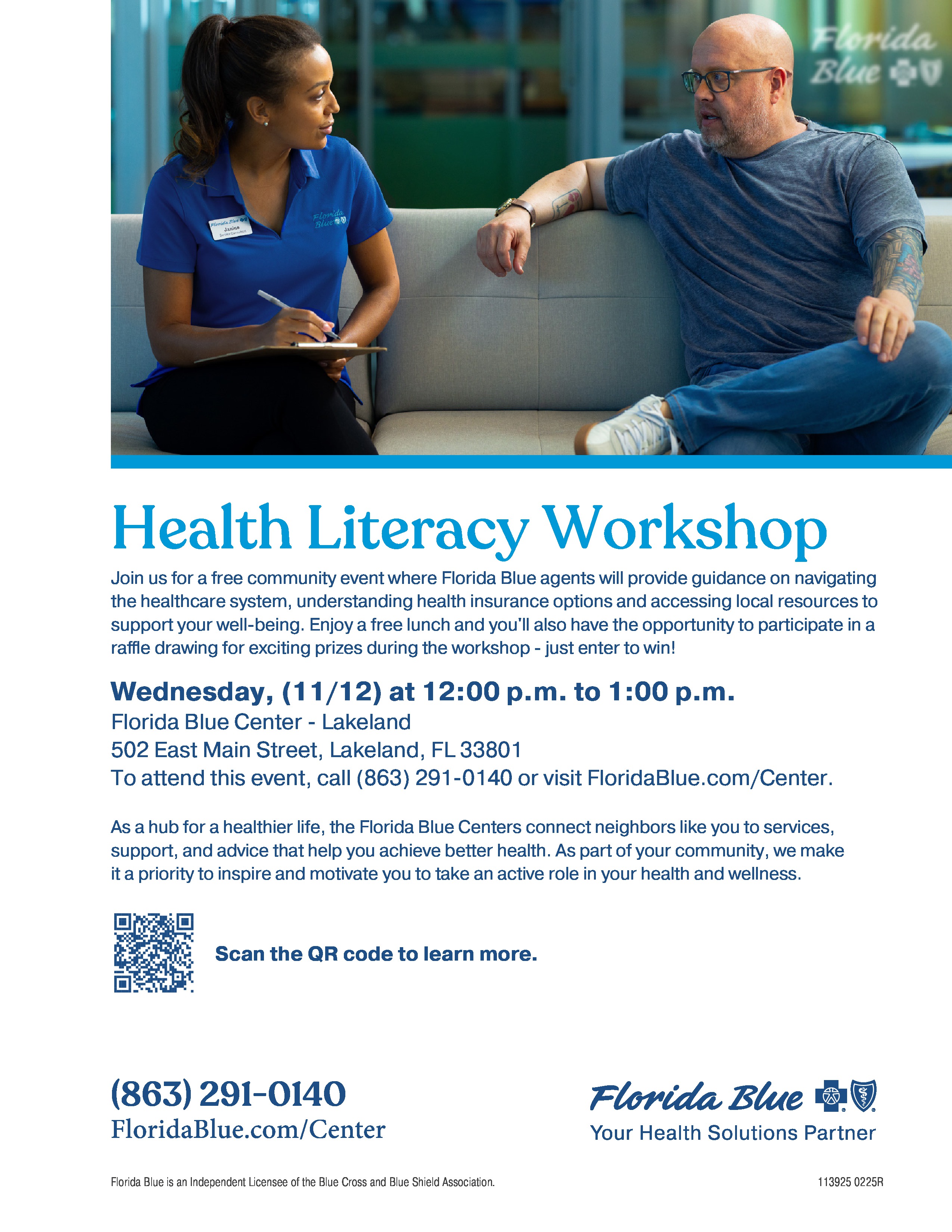 Join Florida Blue for a free community event where Florida Blue agents will provide guidance on navigating the healthcare system, understanding health insurance options and accessing local resources to support your well-being. Enjoy a free lunch and you'll also have the opportunity to participate in a raffle drawing for exciting prizes during the workshop - just enter to win! Wednesday, November 12th, 12 - 1 p.m., Florida Blue Center - Lakeland, Catapult, 502 East Main Street, Lakeland, FL. RSVP to 863-291-0140 or scan the QR Code on the flyer to learn more. Click HERE.