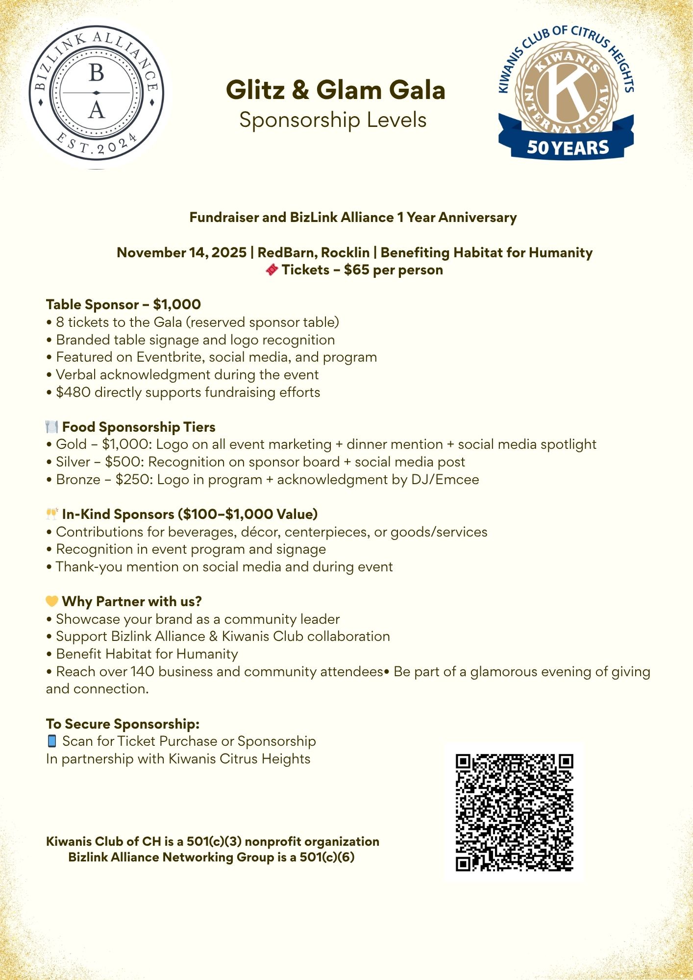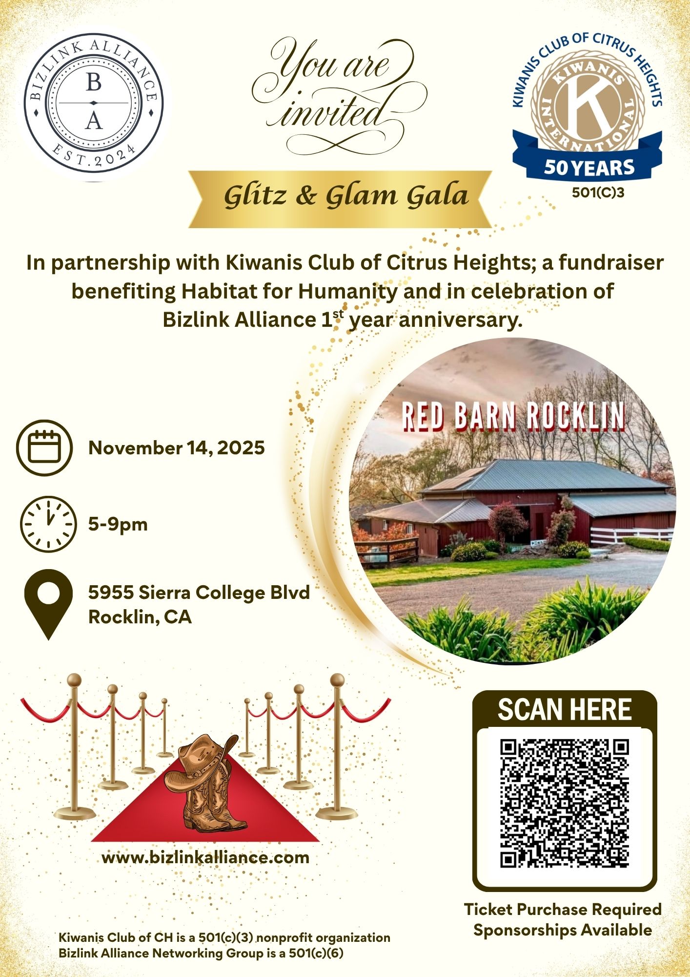 Step into an evening of sparkle, celebration, and purpose as Bizlink Alliance marks its 1st anniversary alongside the Kiwanis Club of Citrus Heights at the Glitz & Glam Gala! π