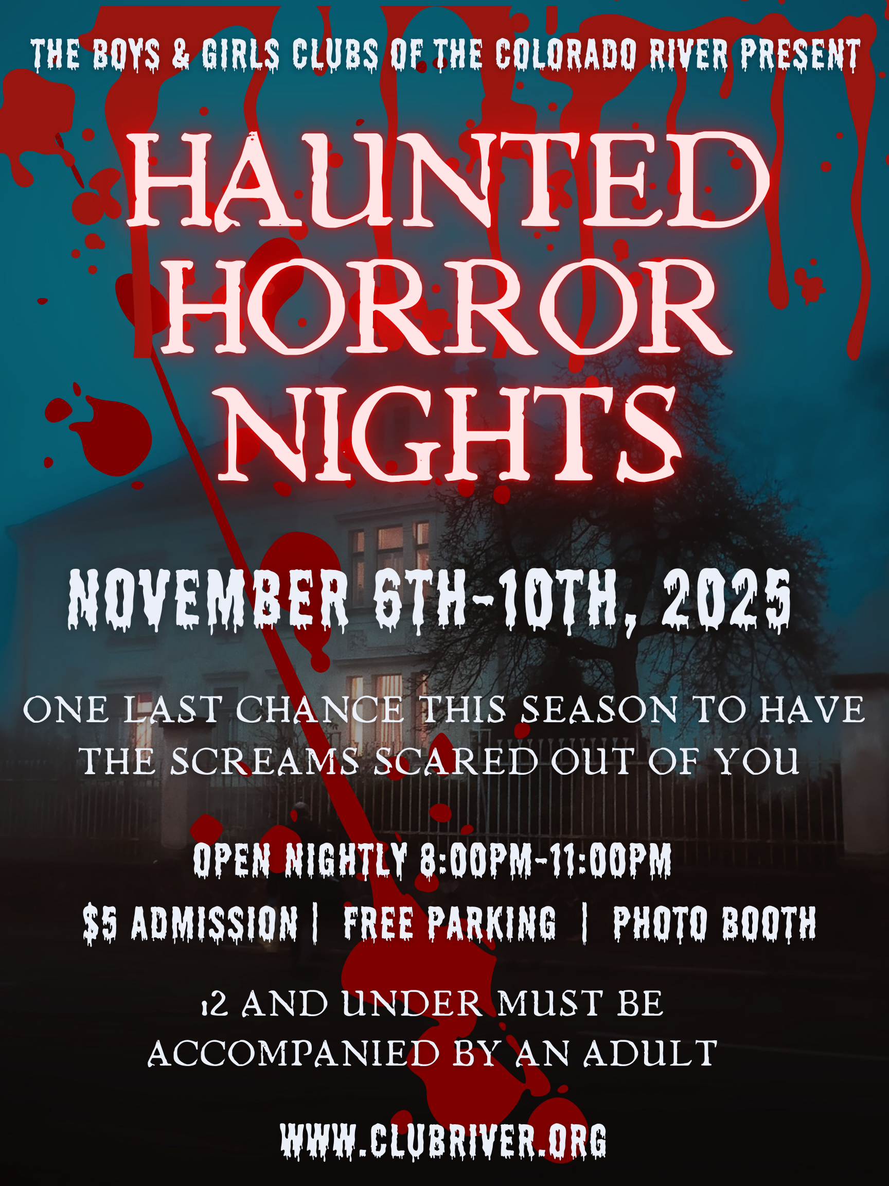 The Boys & Girls Clubs of the Colorado River invites thrill-seekers to experience Haunted Horror Nights, a spine-chilling finale to the Halloween season running November 6–10, 2025. Guests will have one last chance this year to get the screams scared out of them as they venture through terrifyingly themed rooms, unexpected twists, and eerie encounters at the Club’s transformed location on Highland Road.