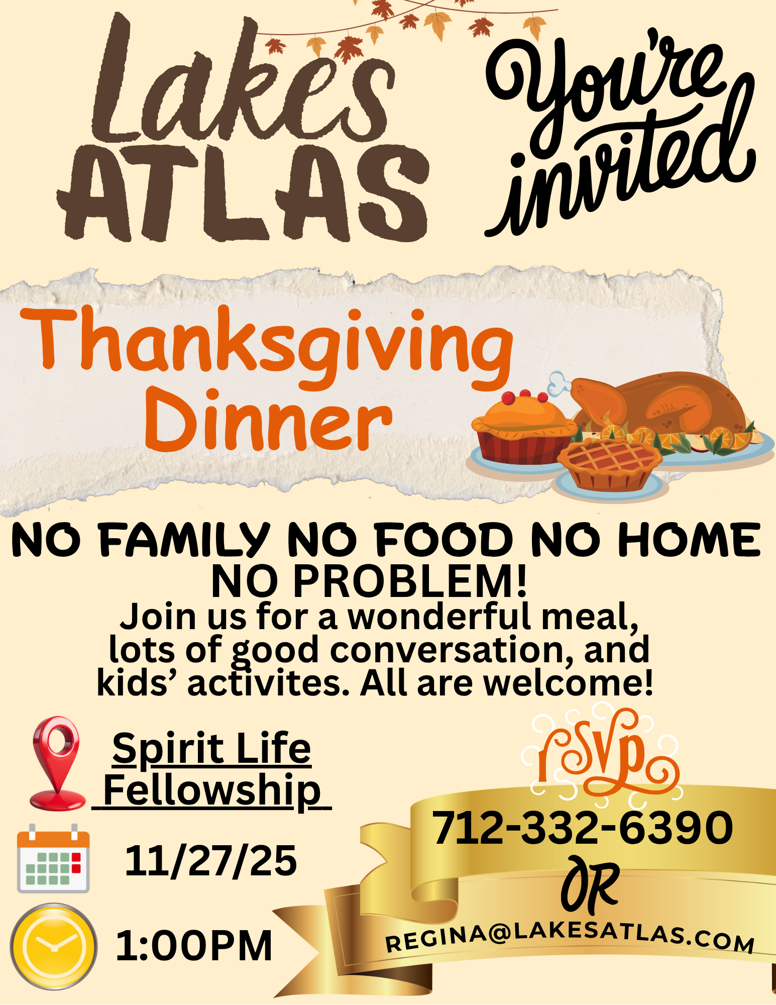 You're Invited! Join us for a wonderful meal, lots of good conversations, and kids' activities. All are welcome!! Spirit Life Fellowship. RSVP 712-332-6390 or email regina@lakesatlas.com 11/27/25 @1:00pm