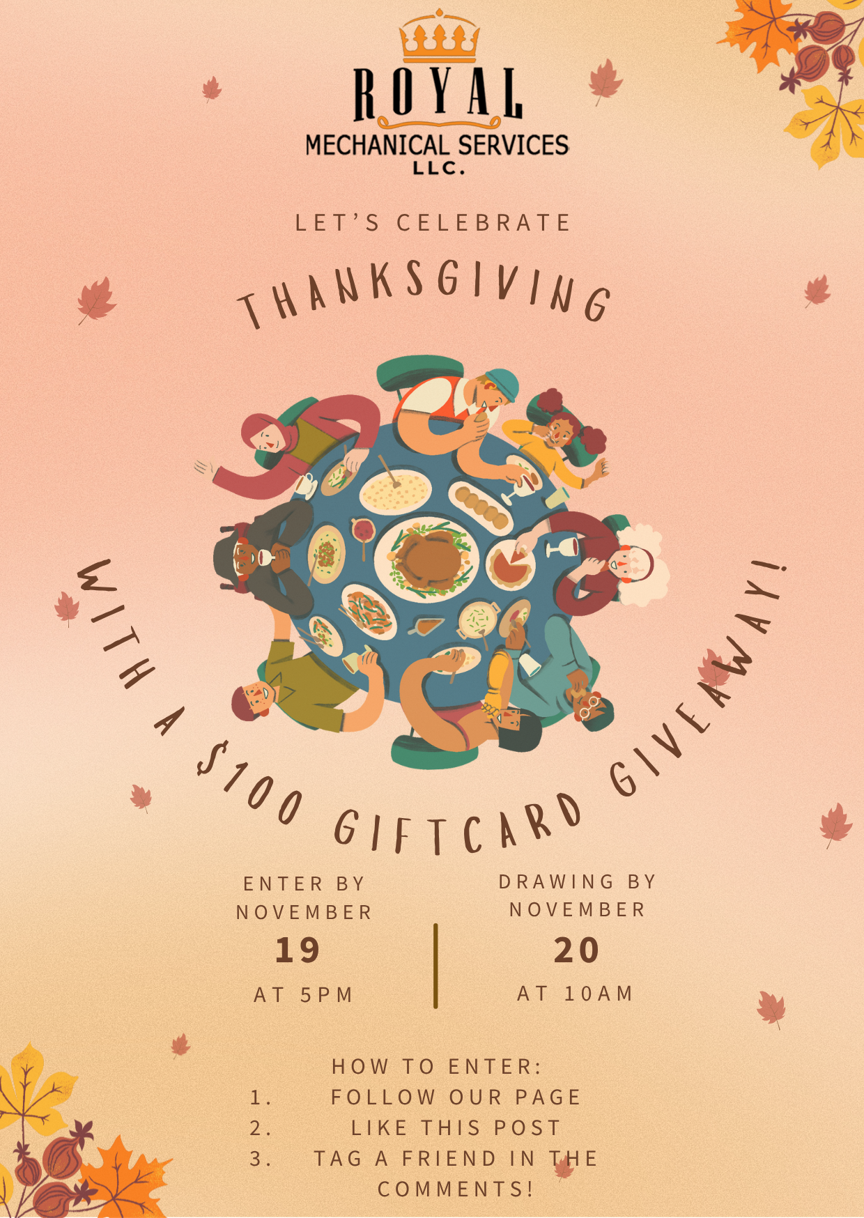 Royal Mechanical Services, LLC is giving back to the community this holiday season by gifting $100 Thanksgiving Dinner Gift Cards to five families in need.