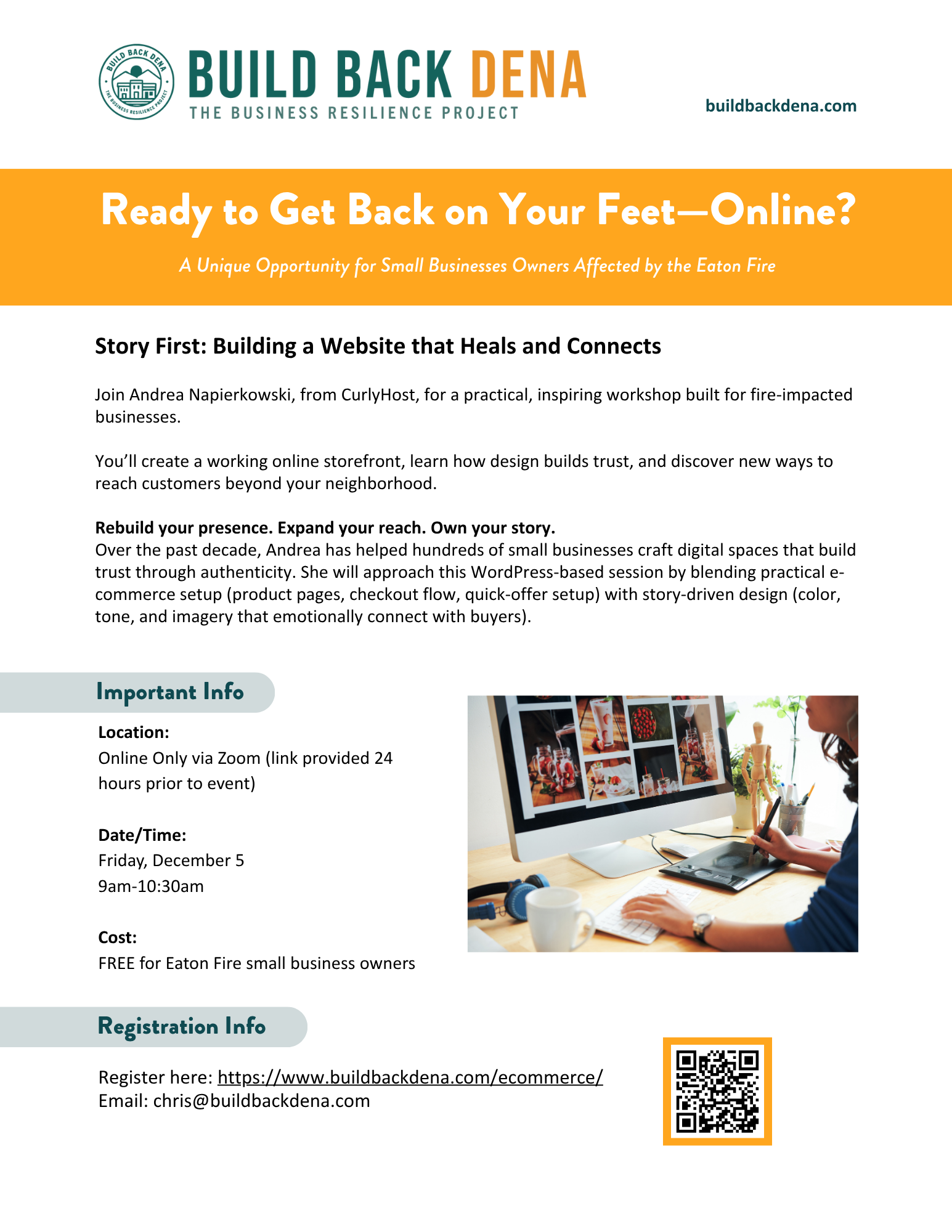 Join Andrea Napierkowski, from CurlyHost, for a practical, inspiring workshop built for fire-impacted businesses.