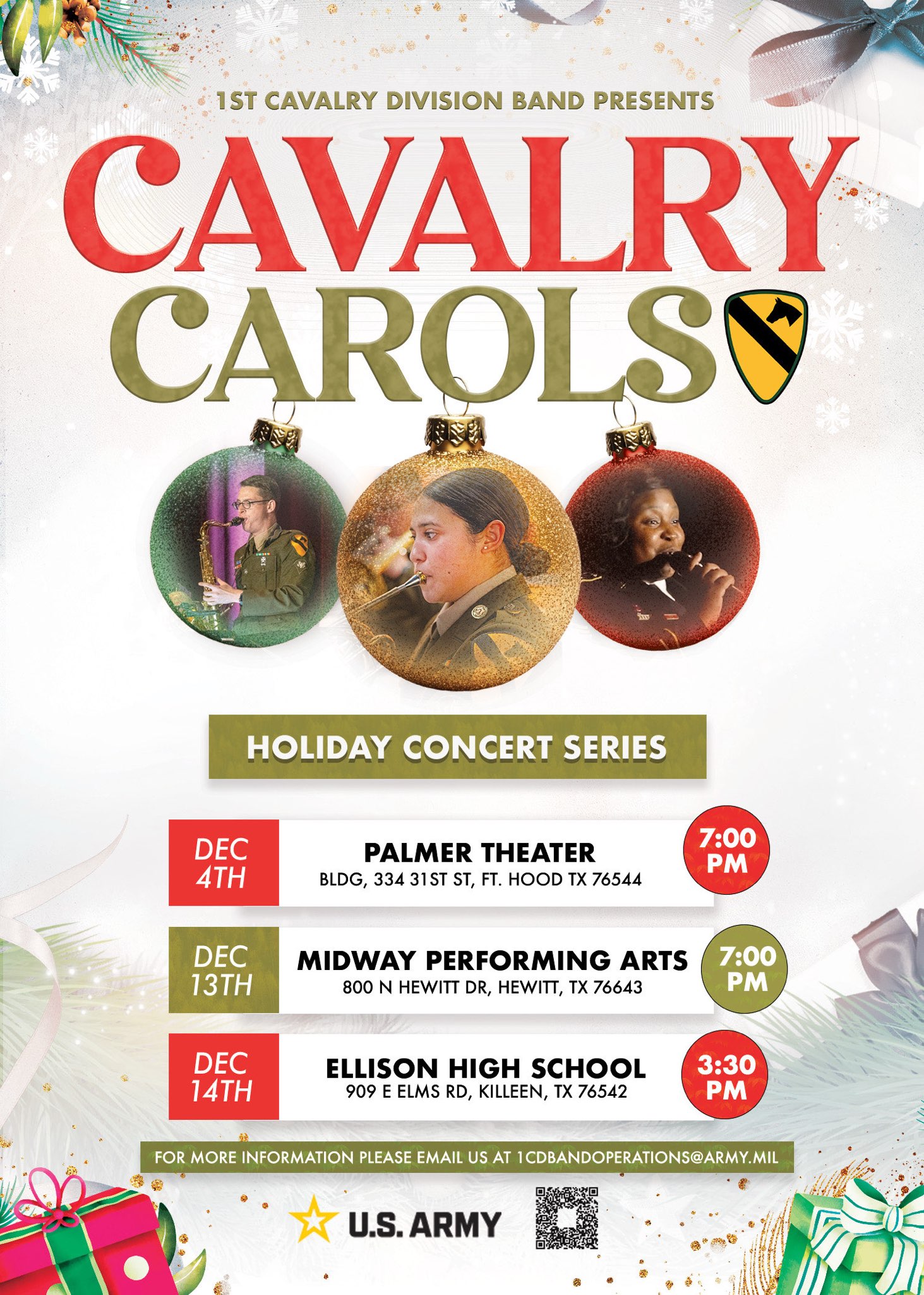 This Holiday season the 1CD Band has prepared an electric show that is FREE and open to the public. Titled Cavalry Carols – A heartwarming holiday performance by the 1CD Band that celebrates the spirit of the season and 250 years of American Strength and Service – leaving audiences inspired, united, and proud of their Army! It is a high energy show that is a blast for people of all ages.