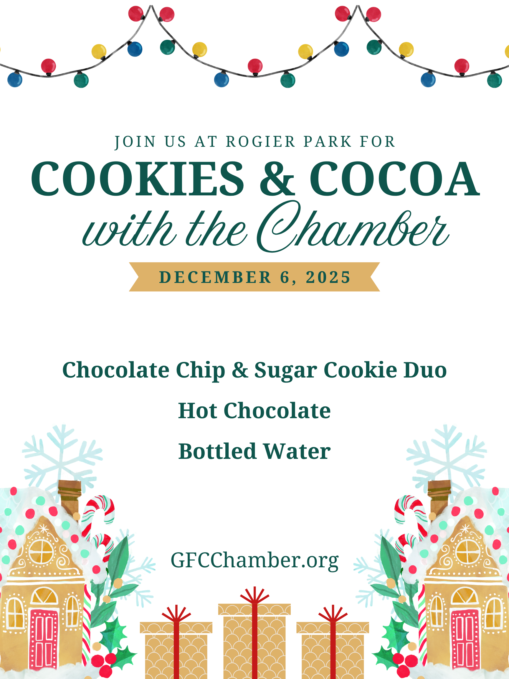 Join us for Cookies & Cocoa with the Chamber at Rogier Park! The Chamber will be handing out a yummy Chocolate Chip & Sugar Cookie Duo, hot chocolate, and bottled water—perfect treats to enjoy while you take in the holiday light display around the park. Stop by, say hello, and share a little festive cheer with us!