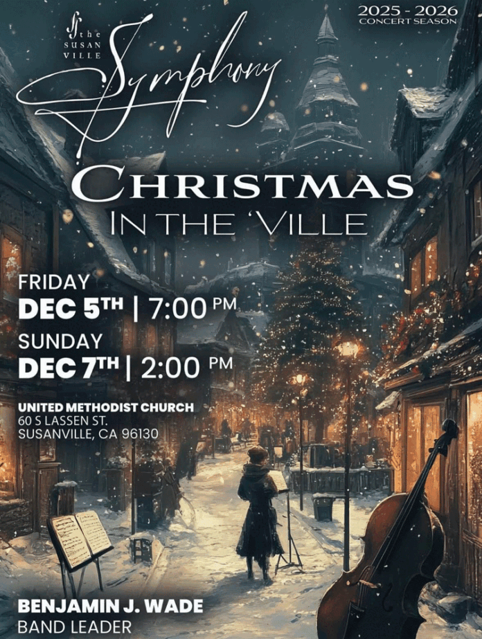 Susanville Symphony Christmas in the Ville Friday, December 5th at 7:00p.m. and Sunday, December 7th at 2:00p.m. at the United Methodist Church.