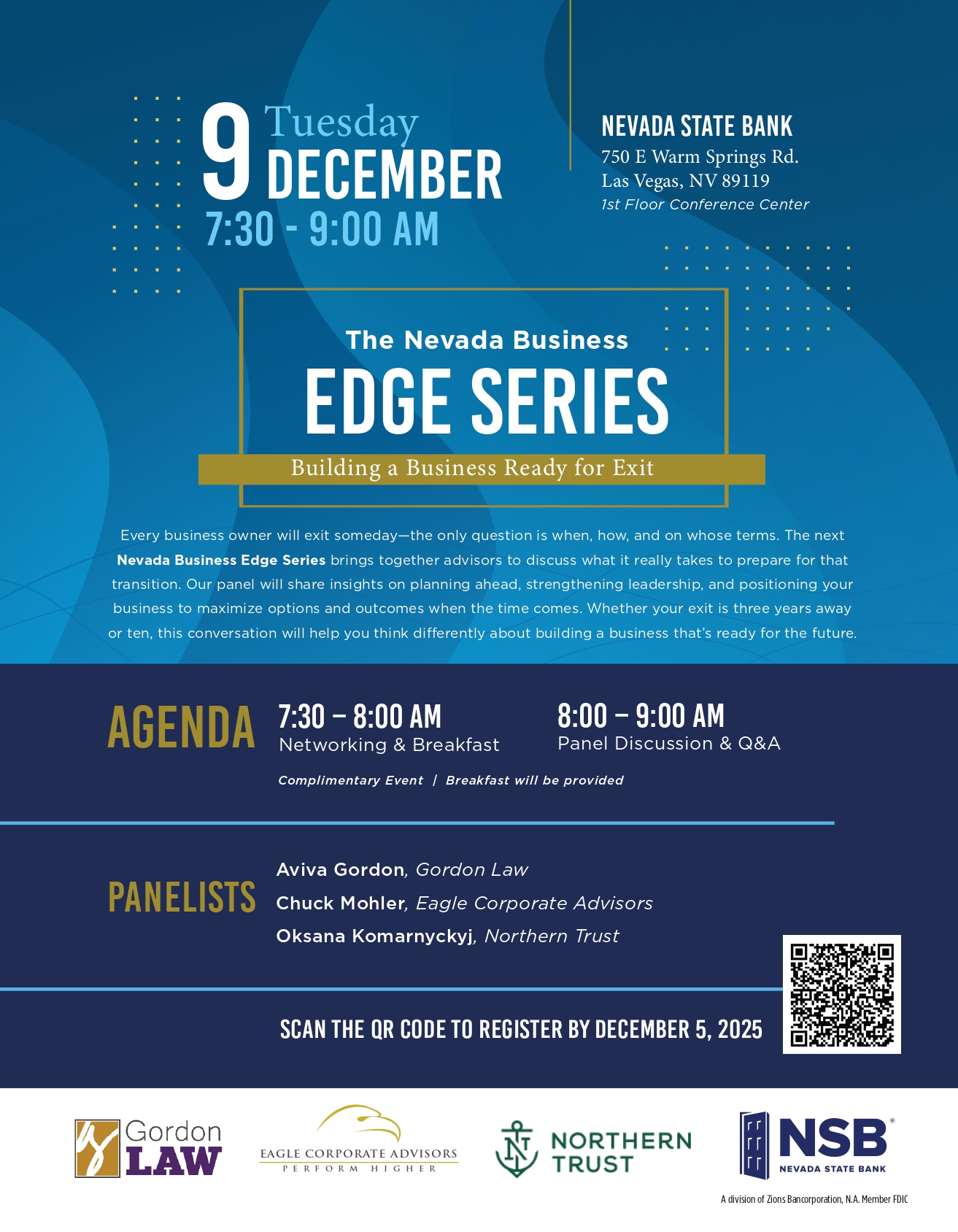 Every business owner will exit someday—the only question is when, how, and on whose terms. The next Nevada Business Edge Series brings together advisors to discuss what it really takes to prepare for that transition.