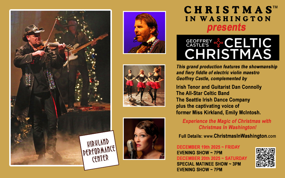 Now a Kirkland tradition, the Christmas Season just won’t be the same after a visit from the Geoffrey Castle’s Celtic Christmas Concerts. This major production features the fiery fiddle of violin virtuoso Geoffrey Castle, energetic and beautiful Celtic dancing with The Seattle Irish Dance Company Dancers, The Geoffrey Castle Celtic Band, Guitarist and Irish Tenor Dan Connolly, singing sensation and former Miss Kirkland Emily McIntosh.