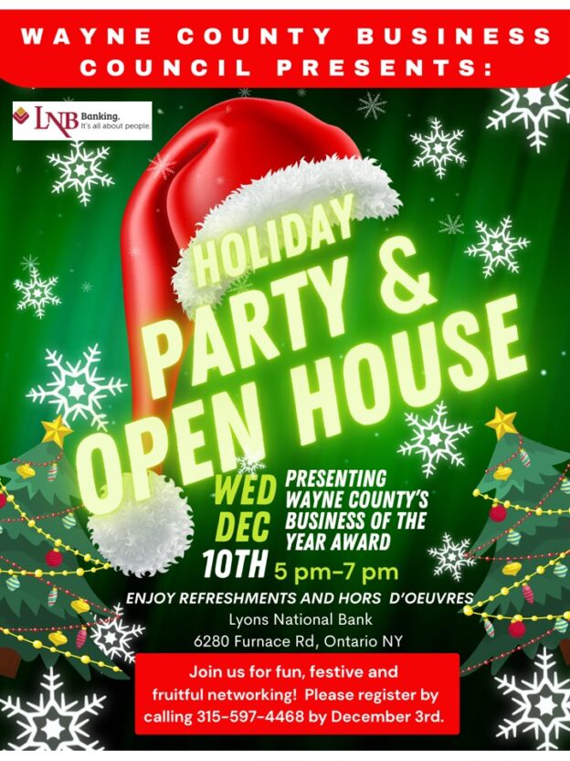 Our merging partner, the Wayne County Business Council, is hosting a holiday party and open house. The Wayne County Business of the Year Award will be presented. Enjoy refreshments and snacks. Join us for fun, festive, and fruitful networking! Please register by calling 315-597-4468 by December 3.