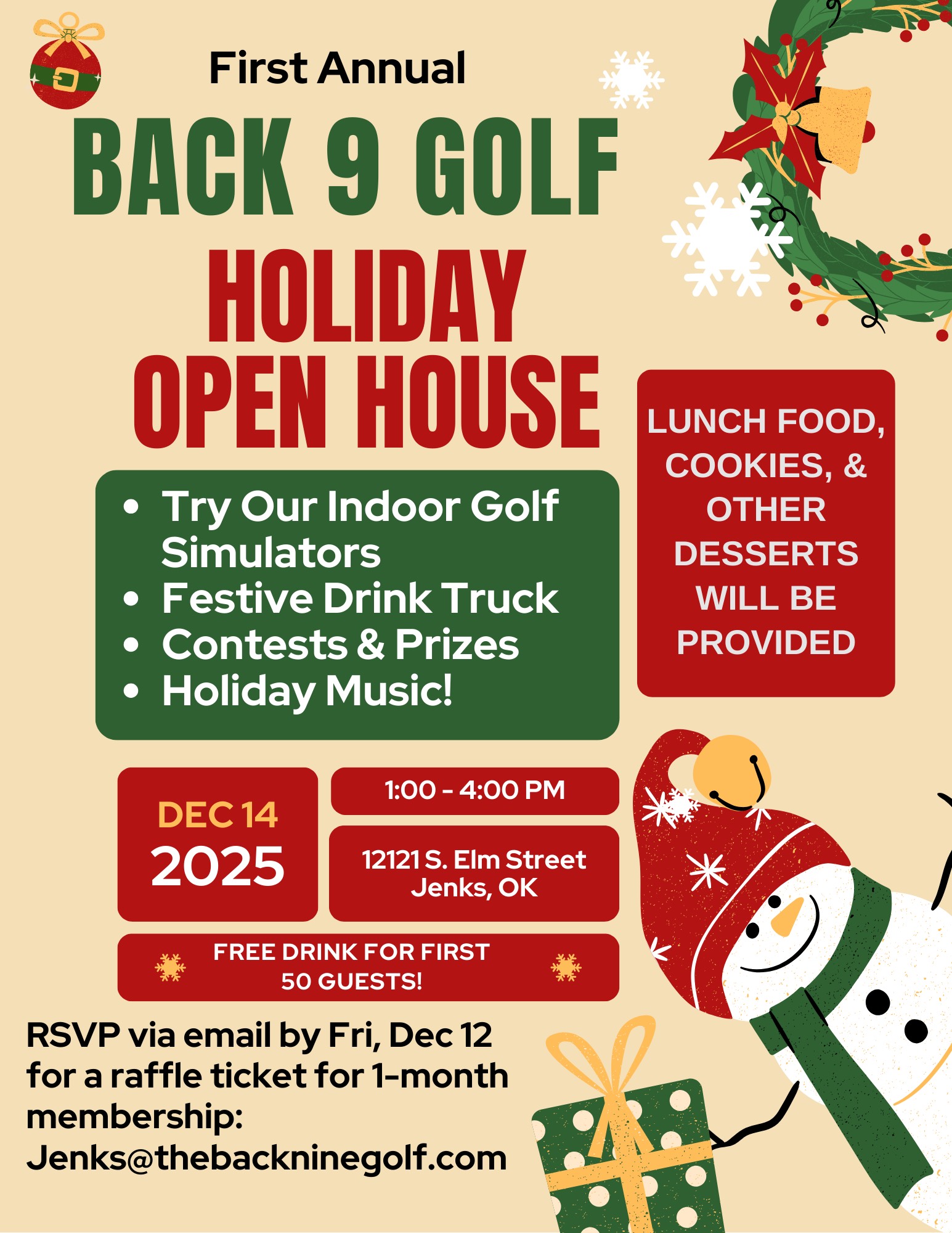 Join us for a fun & festive afternoon at Back Nine Golf! Enjoy indoor golf simulator play, a drink truck, contests, prizes, and holiday music. Food, cookies, and other desserts will be provided. The first 50 guests will receive a free drink.
