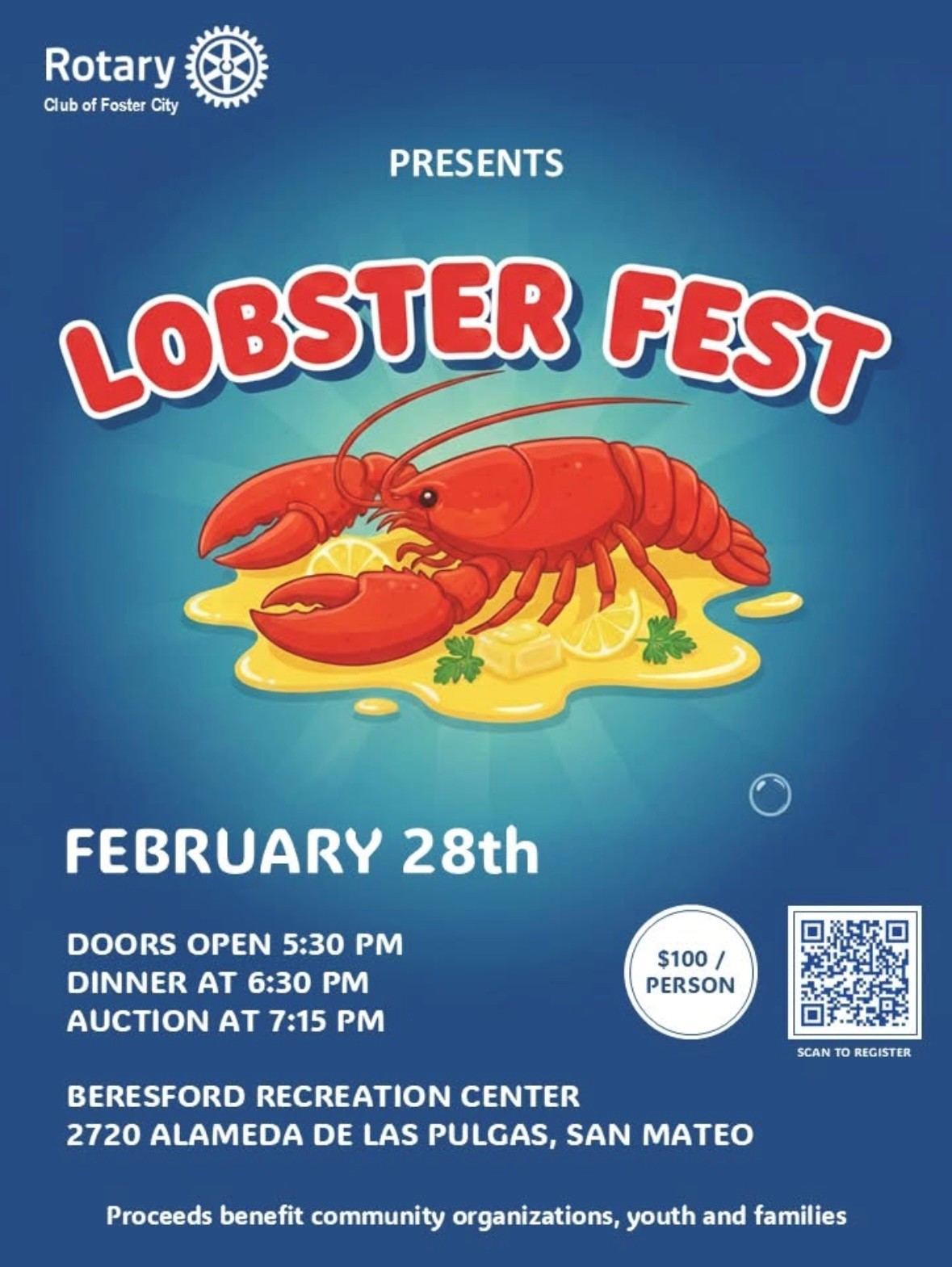 Join the Rotary Club of Foster City for a delicious and festive Lobster Fest! Enjoy an evening of great food, community spirit, and exciting auction prizes — all while supporting local youth, families, and community organizations.
