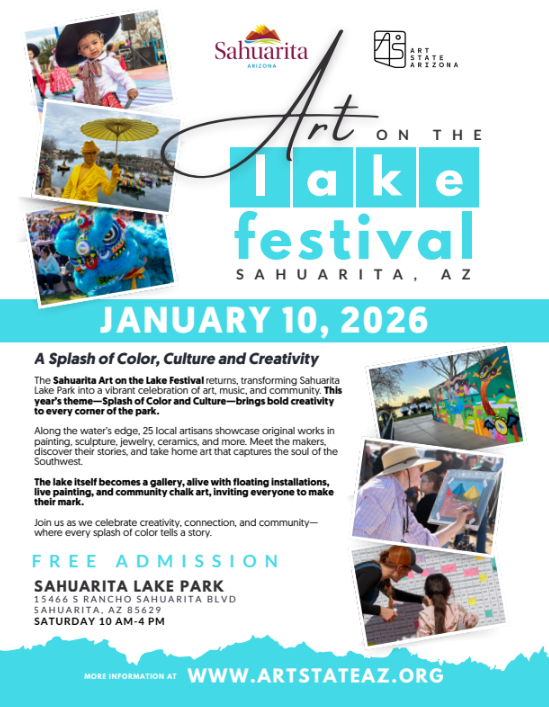 Art State Arizona is excited to share that the Sahuarita Art on the Lake Festival returns to Sahuarita Lake Park on Saturday, January 10, 2026, from 10:00 AM–4:00 PM. Now in its third year, the festival continues to celebrate creativity, cultural expression, and community connection in one of the region’s most beautiful outdoor settings.