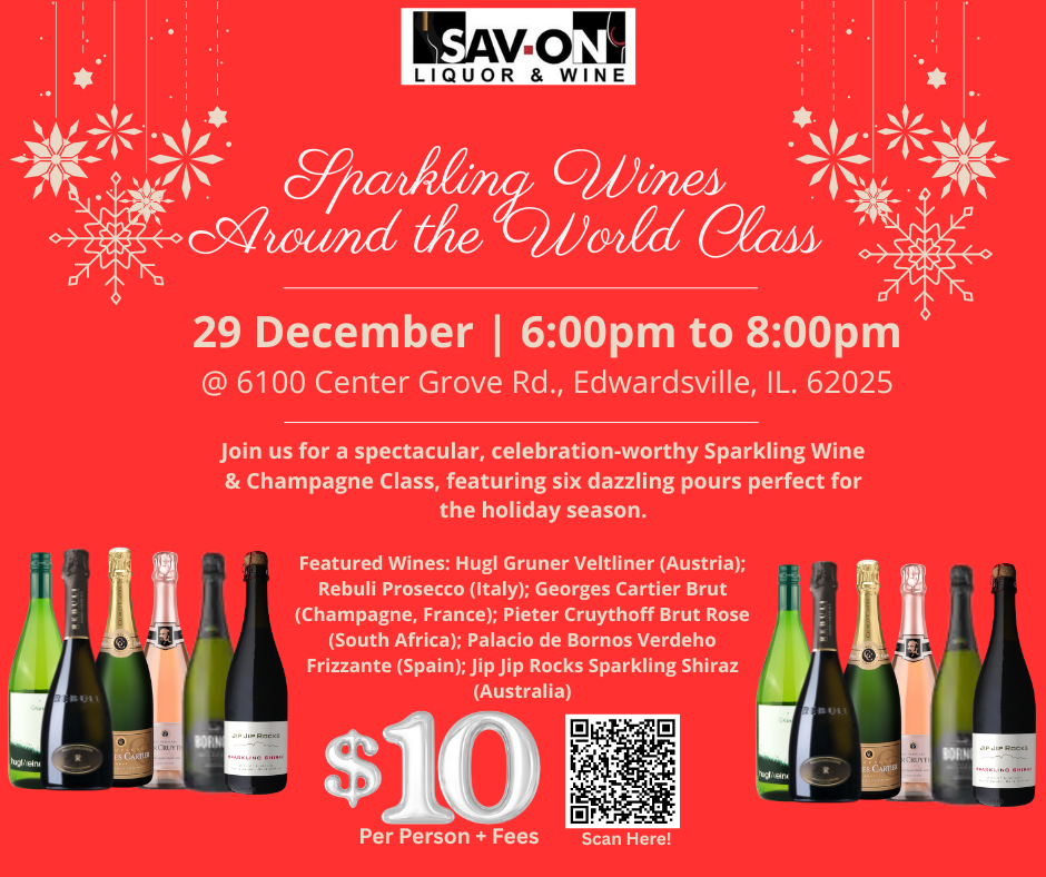 Sav-On Edwardsville is popping bottles on December 29th! Join us for an effervescent evening as we explore Sparkling Wines Around the World with Certified Somm, Sake Professional, and recently knighted Port Wine Brotherhood member Dan Steffan! Taste incredible bubbles from Austria, Italy, France, South Africa, Spain, and Australia—all carefully selected for quality and value. Must be 21+ to attend.
