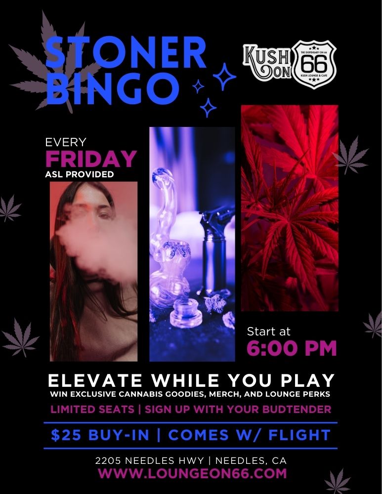 Make your Fridays elevated. Stoner Bingo at Kush on 66 is the ultimate mix of games, cannabis culture, and good company. Play to win exclusive cannabis goodies, merch, and lounge perks — all while enjoying a laid-back, sensory-friendly environment.