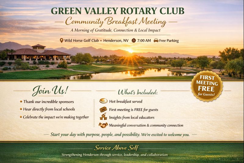 Join us this Thursday morning at 7:00 AM for a special Green Valley Rotary Club meeting as we kick off the year with gratitude and connection. We’ll be recognizing and thanking the generous sponsors of Hoolihan Christmas, alongside special guests including the principals of Robert Taylor Elementary School and Green Valley High School, plus several local business leaders who continue to support our work in the community.