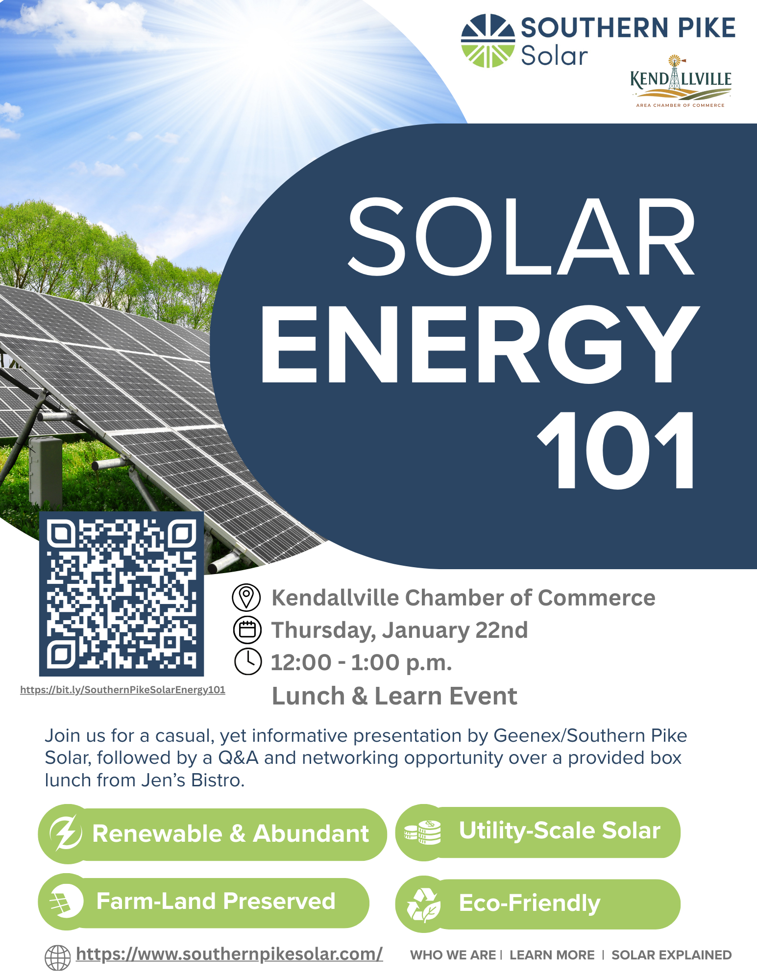 Join us for an informative Solar Energy 101 Lunch & Learn, with Southern Pike Solar. Located at the Kendallville Area Chamber of Commerce. This educational session will cover the basics of solar energy, available incentives, and how solar can benefit homes and businesses. This event is open to members and non-members interested in learning more about renewable energy options. Register to save your spot!