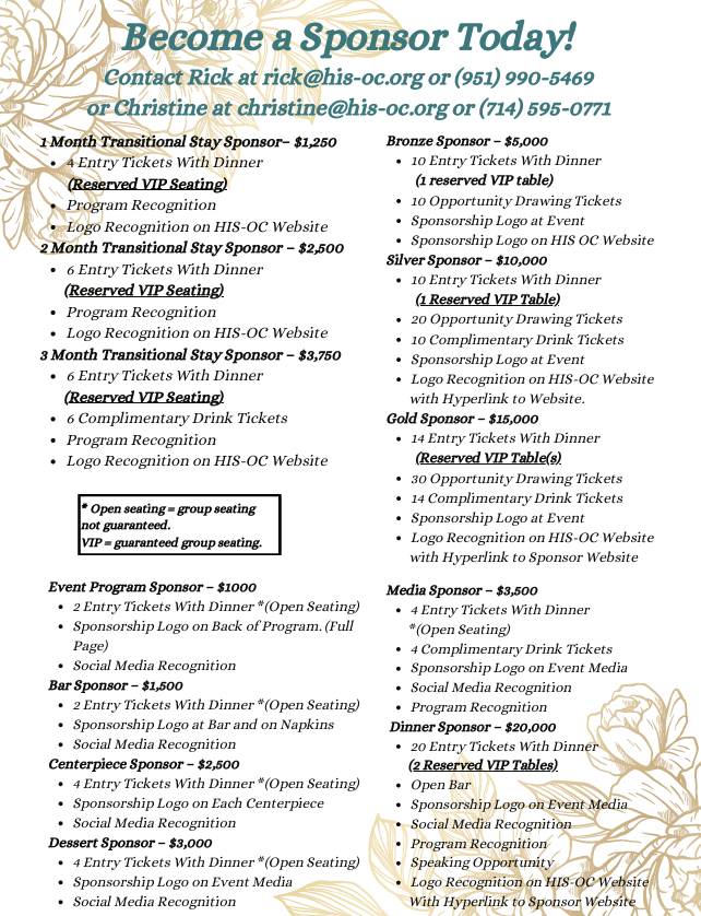 Guests will enjoy a beautiful dinner experience, inspiring stories of success shared by former HIS-OC residents, and important updates on the incredible growth and expanding impact of HIS-OC’s programs and services. The evening will also feature live music, both silent and live auctions, and a variety of meaningful fundraising opportunities designed to help transform lives across Orange County.