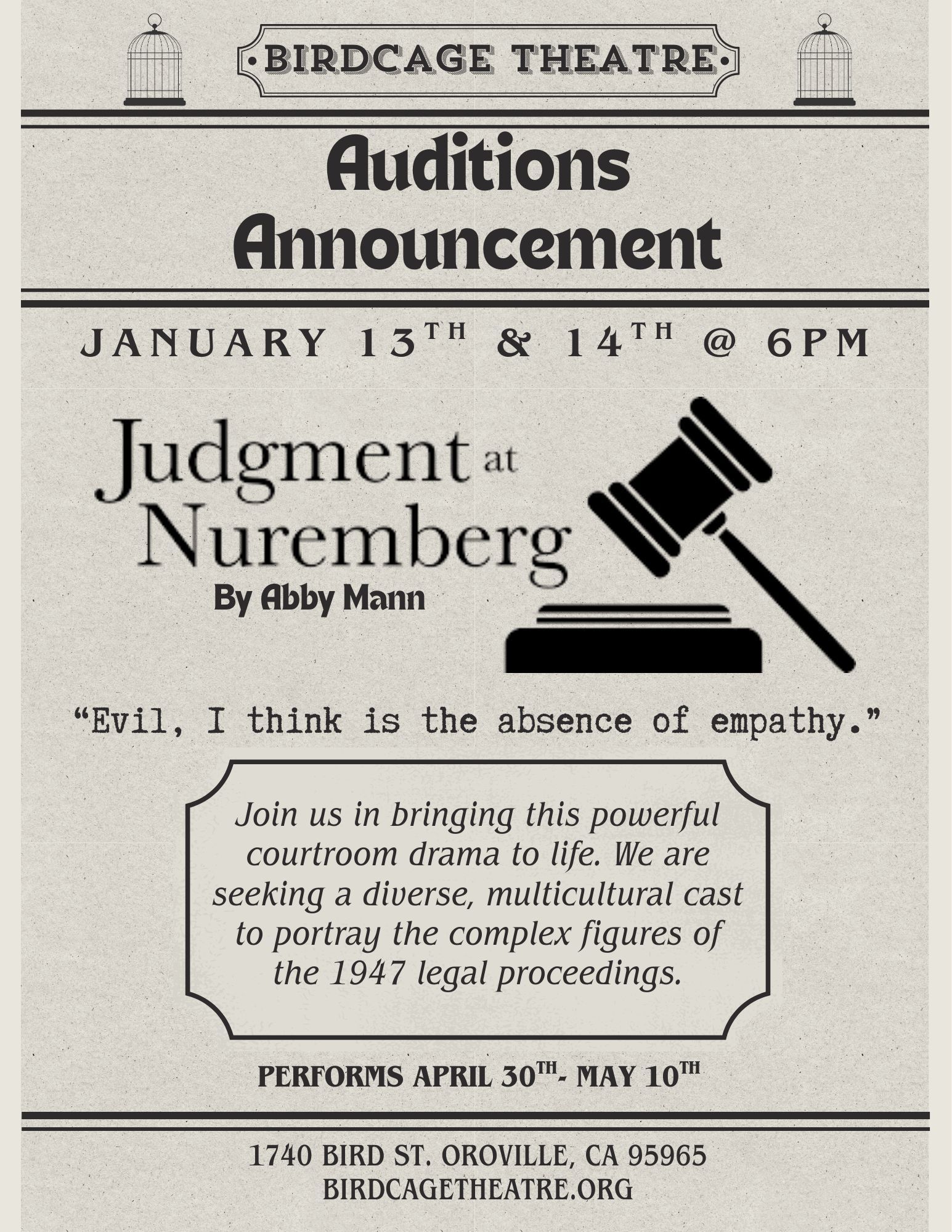 Auditions Announcement: Judgement at Nuremberg