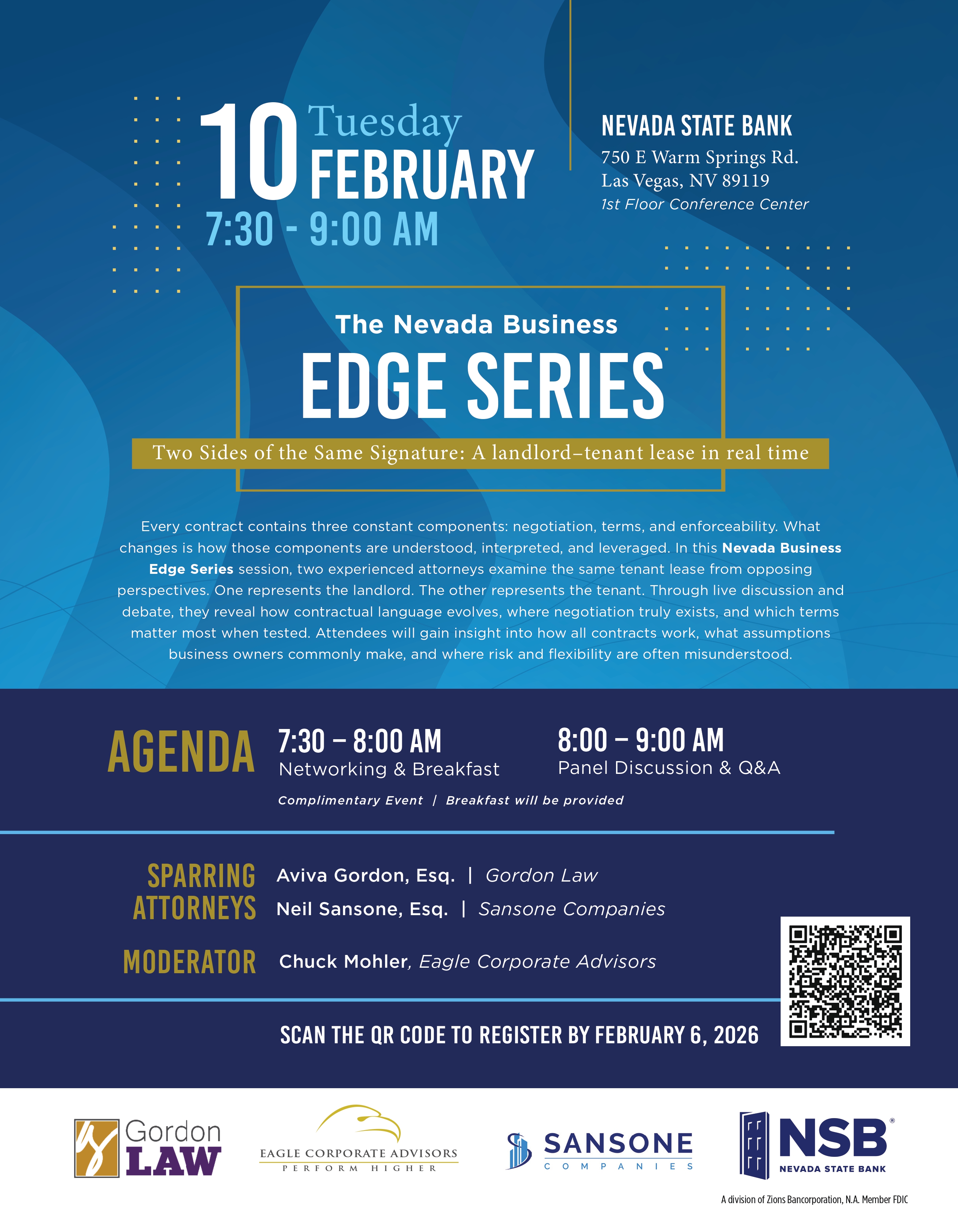 Every contract contains three constant components: negotiation, terms, and enforceability. What changes is how those components are understood, interpreted, and leveraged. In this Nevada Business Edge Series session, two experienced attorneys examine the same tenant lease from opposing perspectives. One represents the landlord. The other represents the tenant. Through live discussion and debate, they reveal how contractual language evolves, where negotiation truly exists, and which terms matter most when tested.