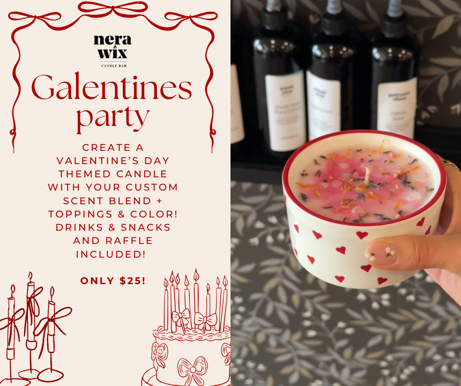 Grab your Galentines and join us in creating a 5 oz Valentine's day themed candle complete with your custom fragrance blend, wax selection, candle color and candle toppers. Upon arrival, you'll be entered to win a Valentine's day themed prize.