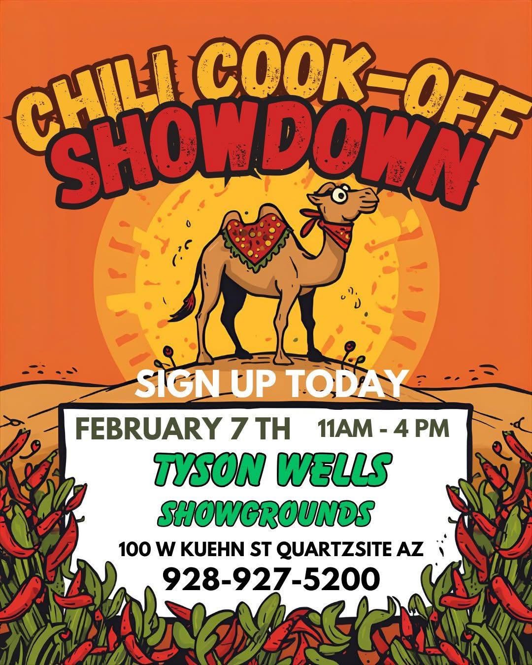 Calling all chili cooks! The Quartzsite Chamber of Commerce and Tyson Wells Enterprises host a Chili Cookoff Saturday, February 7th, 2026. Compete in multiple categories for cash prizes including a $750 grand prize. Register today at qzcoc.org or call 928-927-5200. Or come on by if you're in the area and sample the variety of chilis on tap and cast your vote!