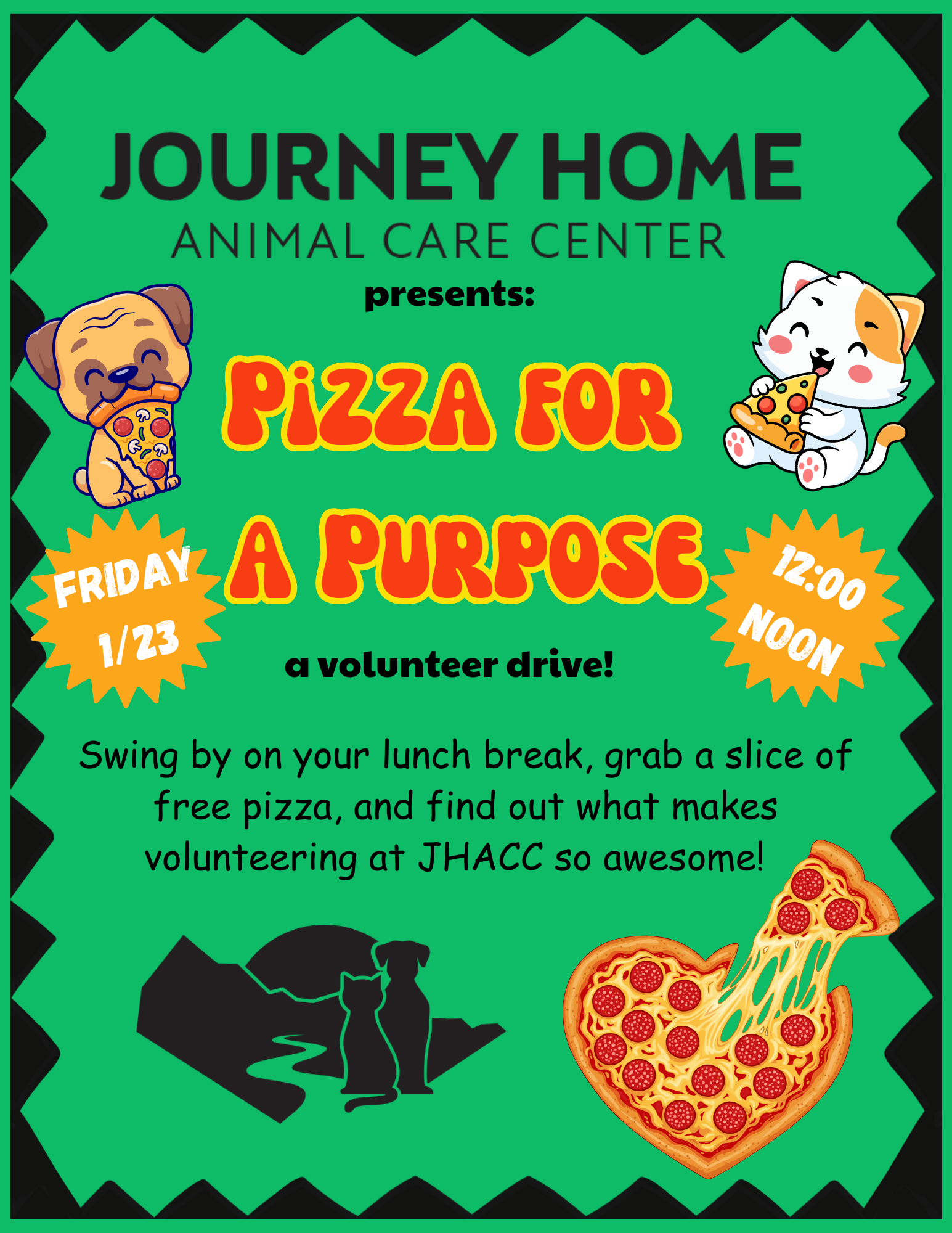 Want to volunteer at the animal shelter, but not sure it's right for you? Come by to find out! Grab a slice of free pizza on your lunch break and get all your volunteer questions answered! 🐾