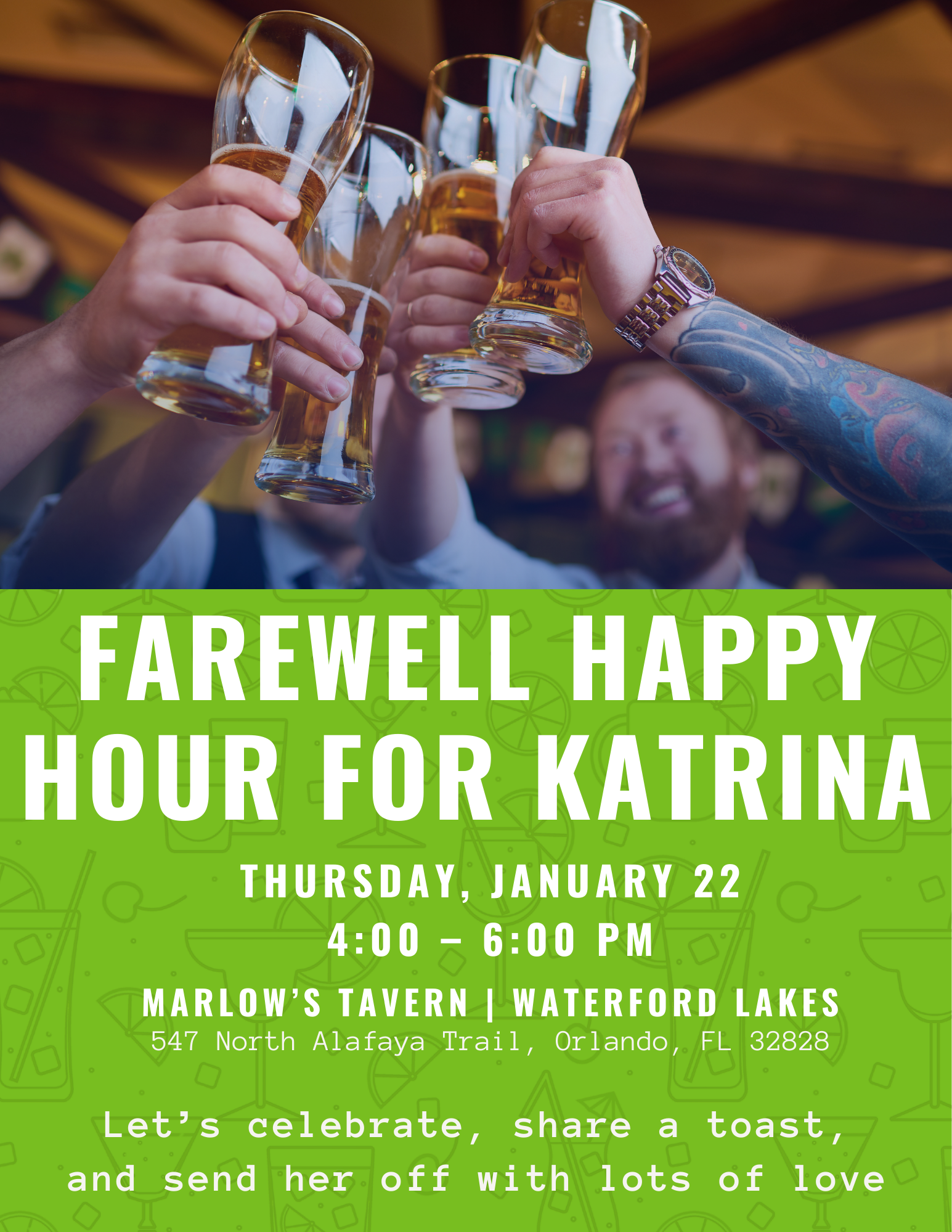 Join us to wish Katrina Claydon a fond farewell as she takes the next steps in her professional journey. Sha has bee a solid staple for the Chamber ov the last year and we cant than her enough for the contributions, support and drive she has contributed to the Chamber's success. Please plan to join us for a happy hour toast to see her off and wish her best wishes on Thursday, January 22 from 4-6pm at Marlow's Tavern Waterford Lakes.