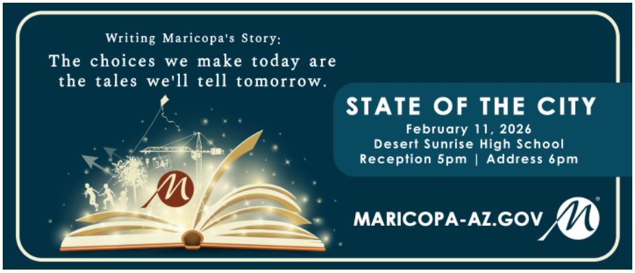 The City of Maricopa is honored to present the 2026 State of the City Address by Mayor Nancy Smith on the evening of February 11 at Desert Sunrise High School. |