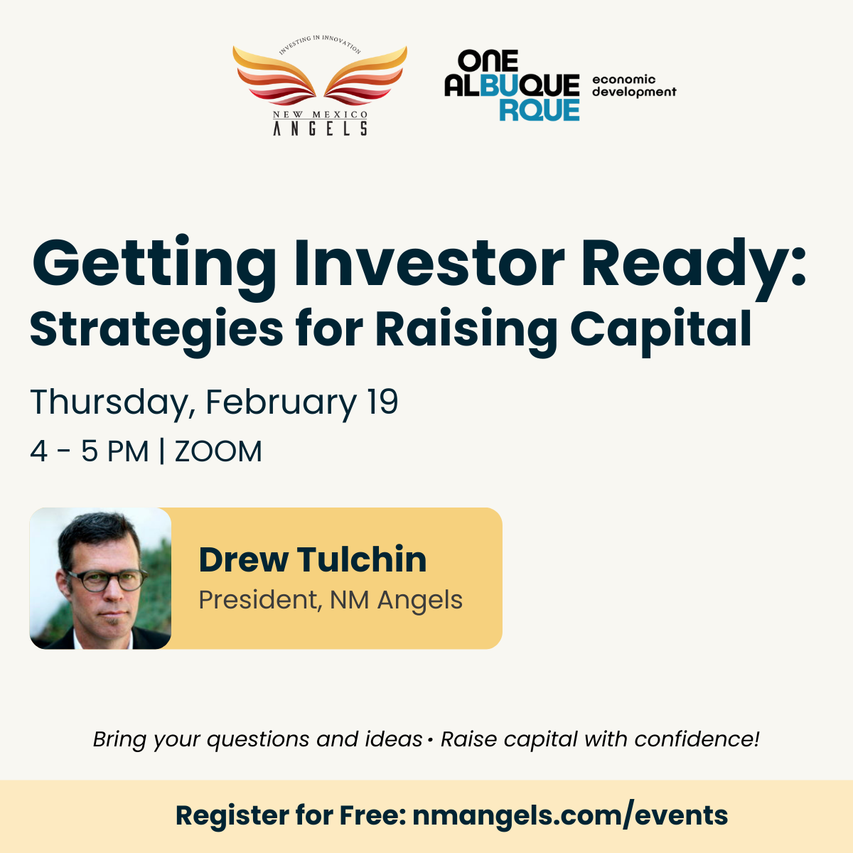 Drew Tulchin, President of New Mexico Angels and General Partner of the New Mexico Vintage Fund, will share practical strategies and insider tips to raise capital. His experience includes being the first CFO of Meow Wolf where he raised more than $100 million, and helping more than 50 entities bring in money.