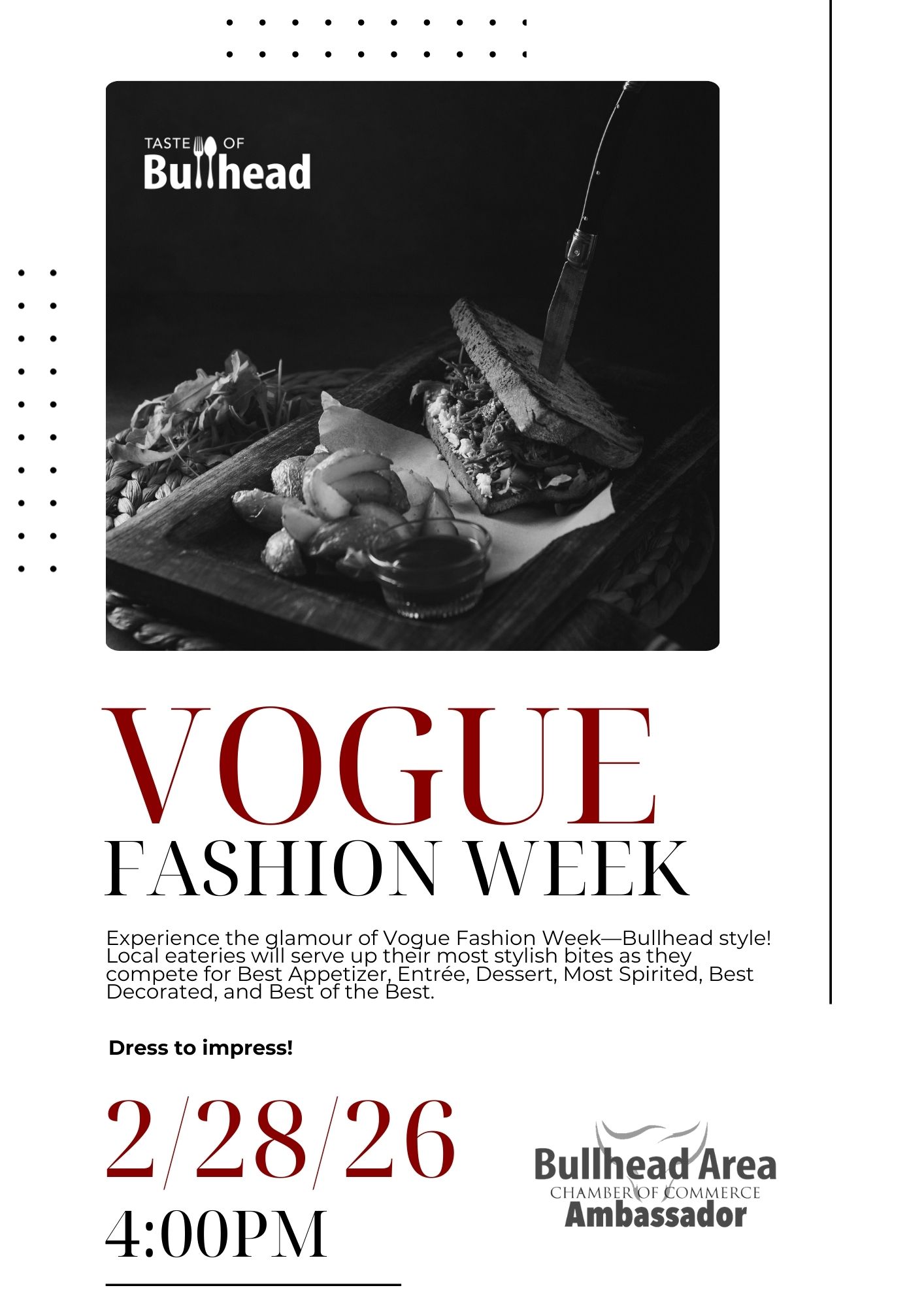 Experience the glamour of vogue Fashion Week-Bullhead style! Local eateries will serve up their most stylish bites as they compete tor Best Appetizer, Entree, Dessert, Most Spirited, Best Decorated, and Best of the Best!