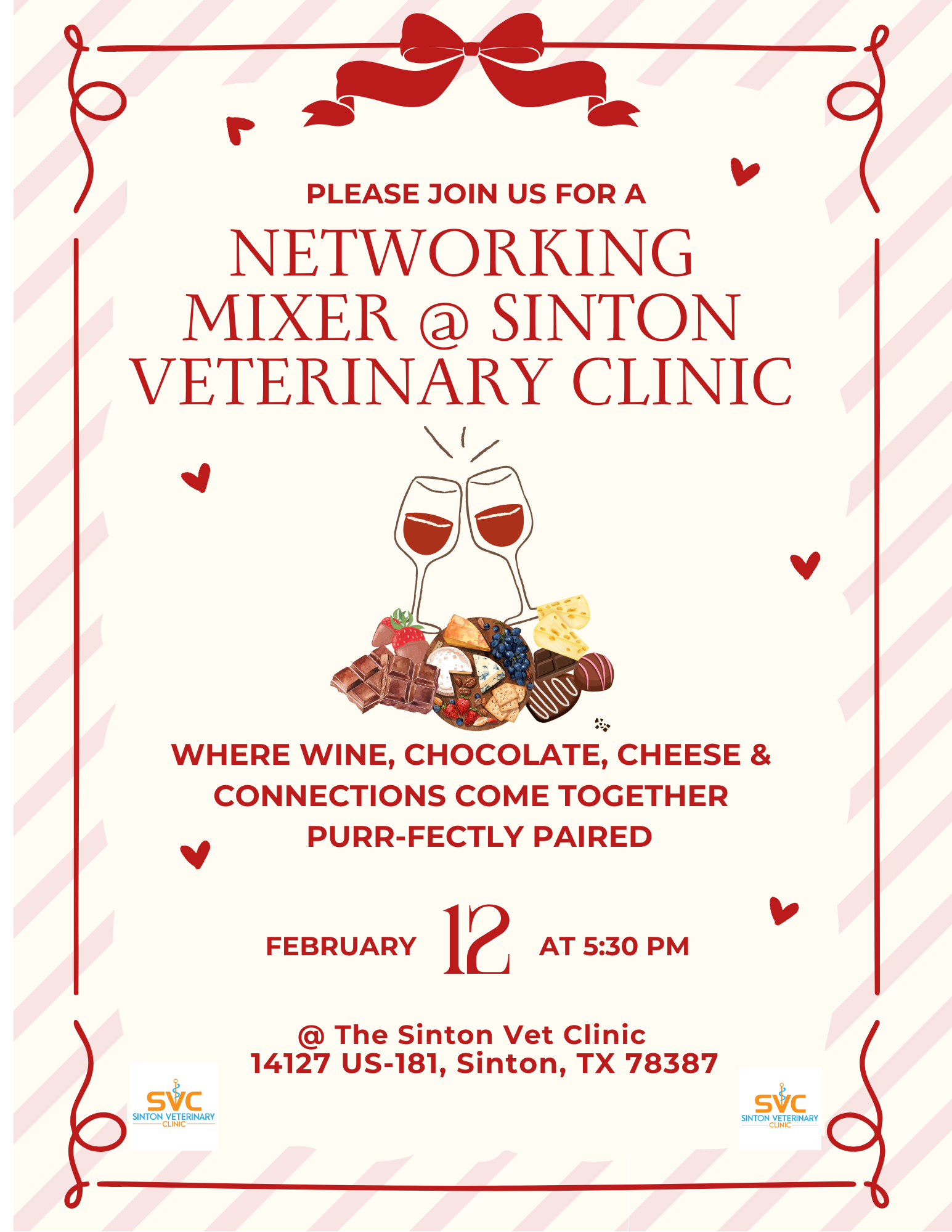 Get ready to sip, snack, and socialize at our Business Mixer at Sinton Veterinary Clinic! Enjoy wine, chocolate, and cheese pairings, prize drawings throughout the night, and plenty of chances to mix, mingle, and make connections. It’s the purr-fect recipe for a fun and unforgettable evening!