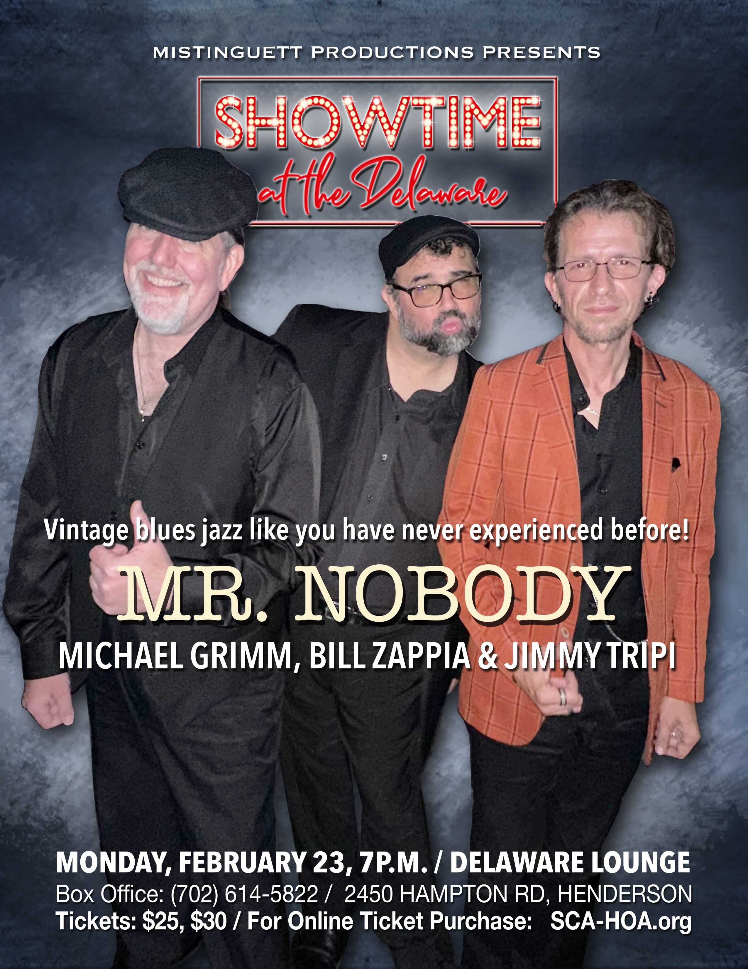 Three incredible musicians take the stage in the form of a vintage speakeasy trio! Mr. Nobody features multi award-winning singer/songwriter & Las Vegas headliner Michael Grimm, piano/comedy extraordinaire Bill Zappia and multi-instrumentalist & soul singer (aka Golden Boy) Jimmy Tripi. The trio plays vintage blues jazz like you have never experienced before! Along with some special material that only Nobody performs. Come check out this underground performance of - Mr. Nobody!