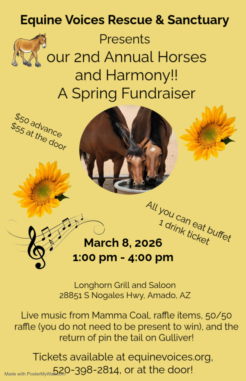 Equine Voices Rescue & Sanctuary in Amado is holding their 2nd Annual Horses and Harmony Spring Fundraiser at the Longhorn Grilll and Saloon on Sunday, March 8th, from 1pm to 4pm. They believe that every equine (horse, donkey/burro, mule) deserves safety, care, and a second chance at a happy life. Attendees can help make that possible by joining them at this event. Proceeds from this event support rescue, rehabilitation, and lifetime care if needed. Please join them at this event to help support the lifesaving work done every day by Equine Voices Rescue & Sanctuary