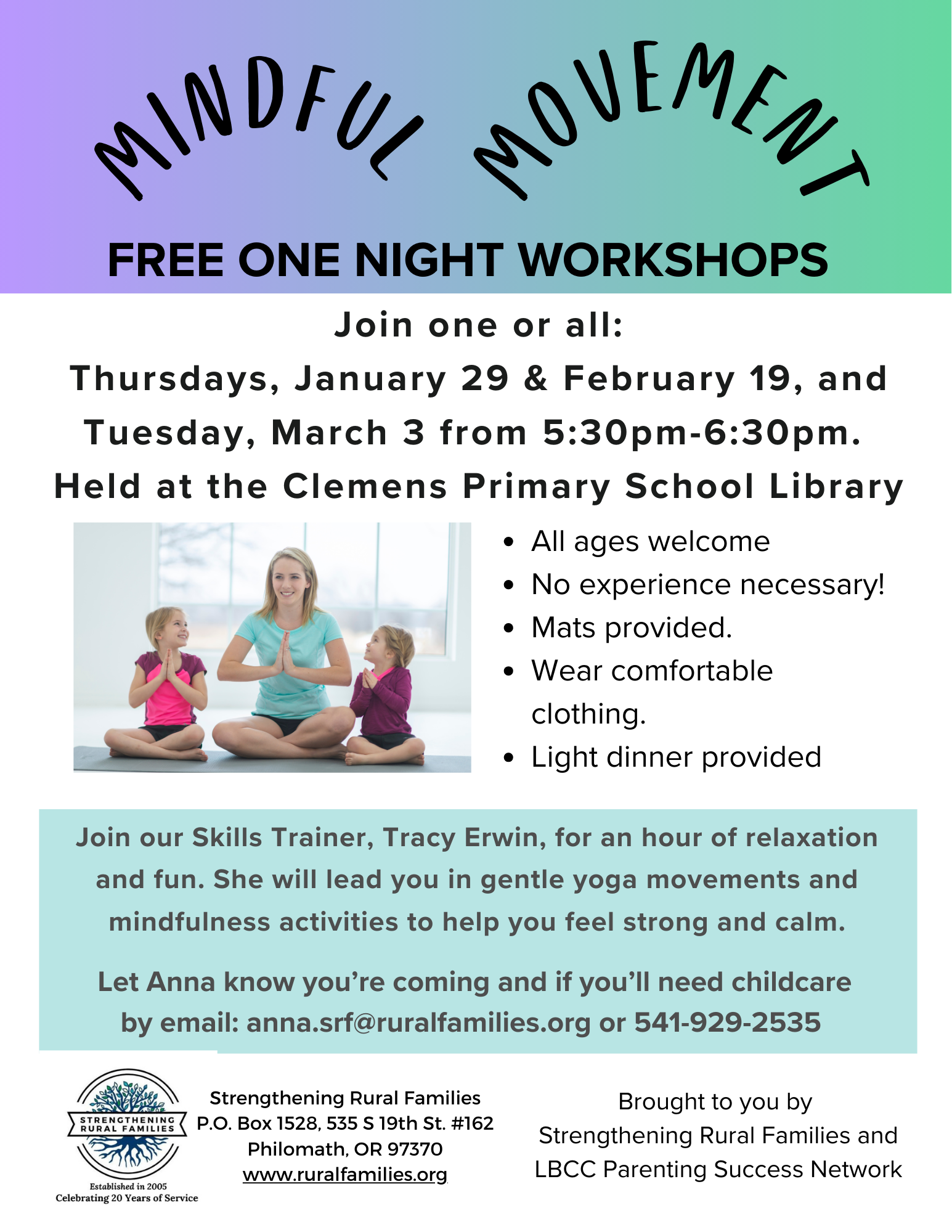 We are looking forward to hosting our Mindful Movement Workshops at the Clemens Primary School Library,  open for the community. All ages welcome to these three separate workshop dates (1/29, 2/19 & 3/3). Join one workshop or join all with our Skills Trainer, Tracy Erwin, for an hour of relaxation and fun. There will be a light dinner provided.