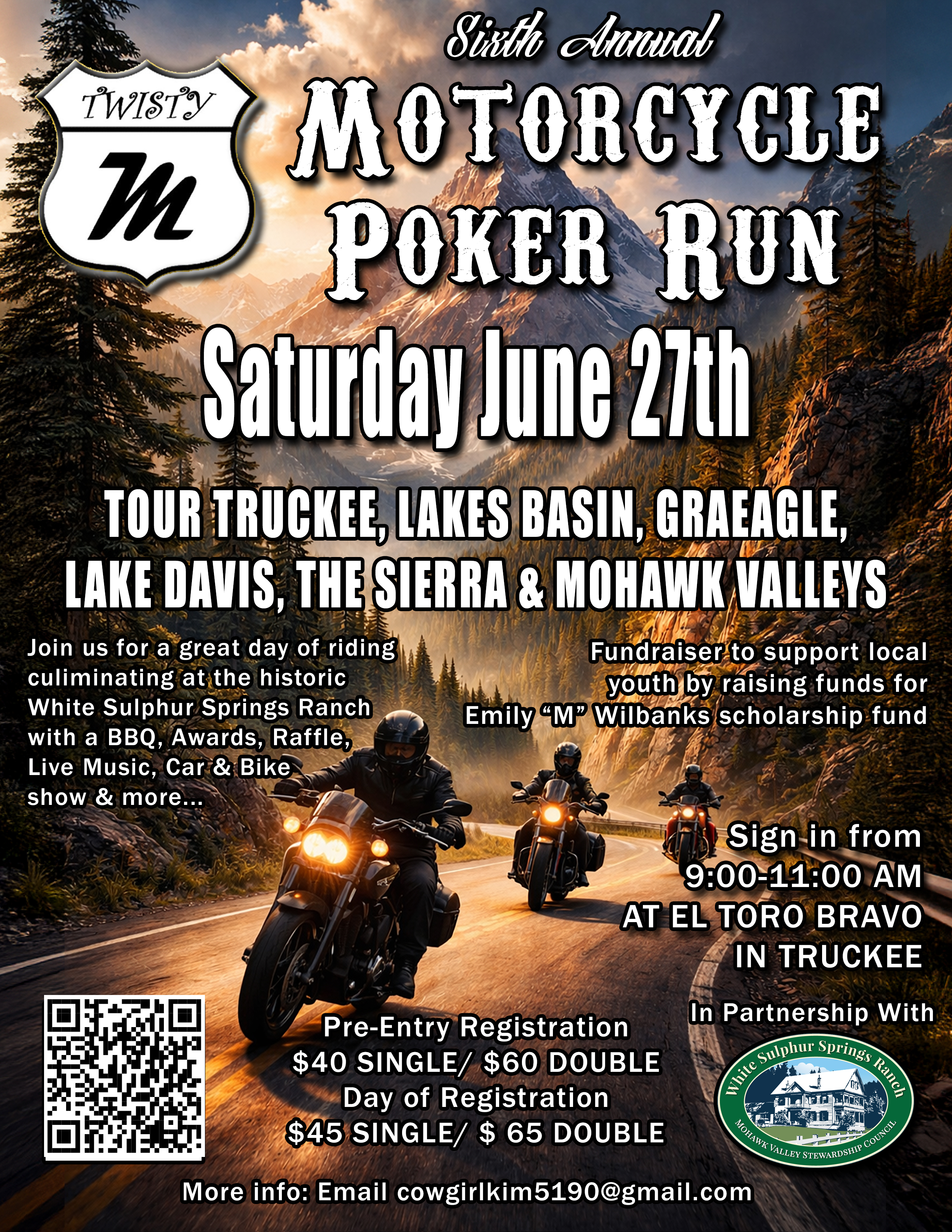 This scenic poker run will give you a fantastic "twisty" experience as you tour the mountains, rivers, and lakes of the Northeastern Sierras on your bike. Begin your tour at the EL Toro Bravo Mexican Restaurant in Truckee to get your instructions and your ride pin. Your trek will cover 90 miles of beautiful curving Sierra Nevada highway from Truckee north into the Lakes Basin, Graeagle, and Lake Davis areas. Finish in the beautiful Mohawk Valley at the historic White Sulphur Springs Ranch. There you'll be treated to bar-b-que, live music, games, and awards while exploring this historic ranch & stagecoach stop. The views from the newly built amphitheater are amazing! Tours of the ranch house will be available! There will also be a silent auction & raffle, so come prepared for FUN!