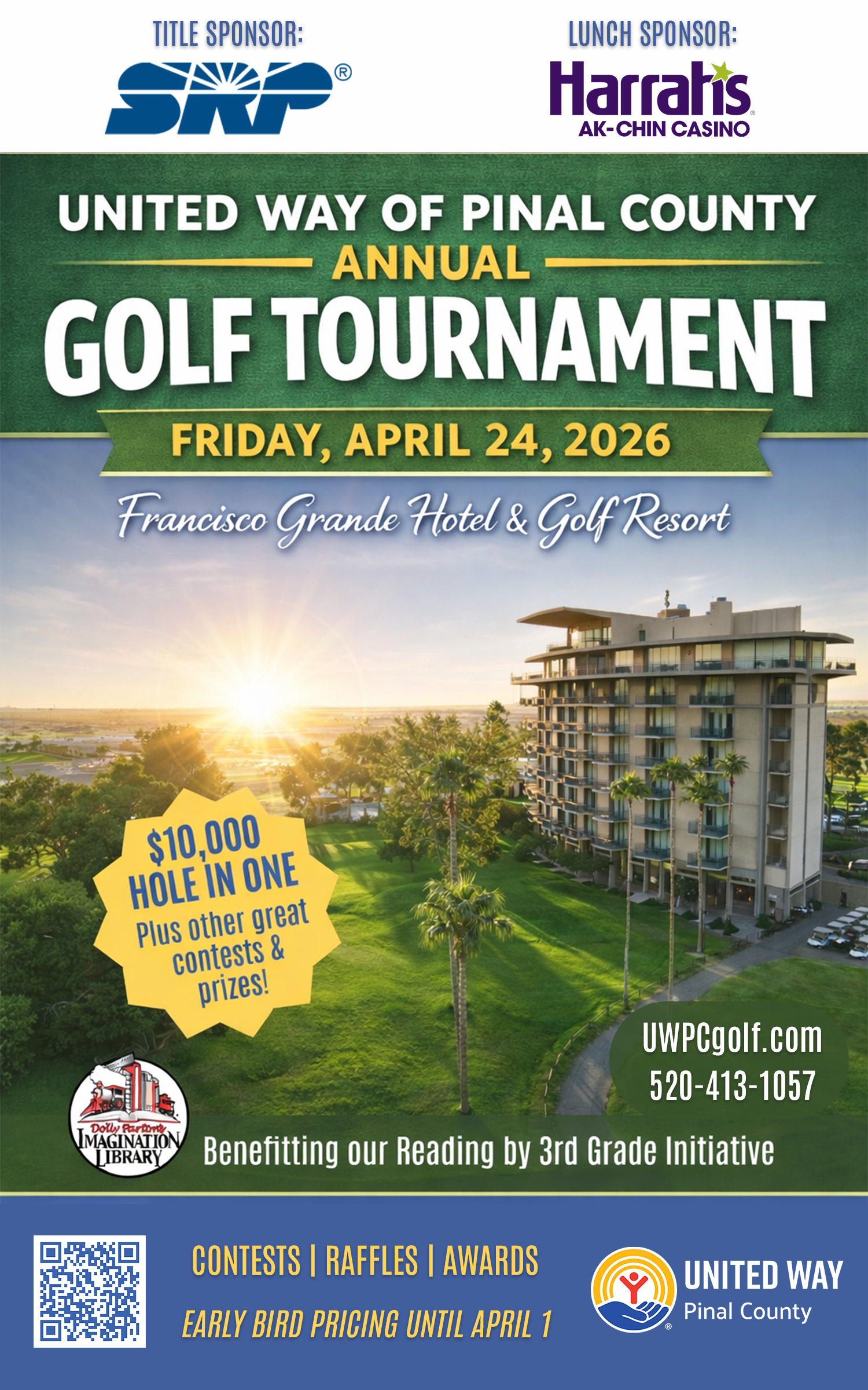 Join us for a fun Friday of golf to benefit literacy for our children in Pinal County. All proceeds will benefit our reading by 3rd Grade Initiative, in partnership with Dolly Parton’s Imagination Library, to provide books to children under the age of 5 to develop critical literacy skills and prepare them for kindergarten. Most recent AZ test scores reflect only 27% of Pinal County 3rd graders are reading, and 90% of a child's brain develops by age 5, so reading to young children is key to preparing them for school and reading. All golfers will enjoy a light breakfast, practice balls, golf, cart, lunch, a welcome bag and more. We have exciting updates and new contests this year including a chance to win $10,000 cash for a hole in one! Visit UWPCgolf.com to learn more, sponsor and register.