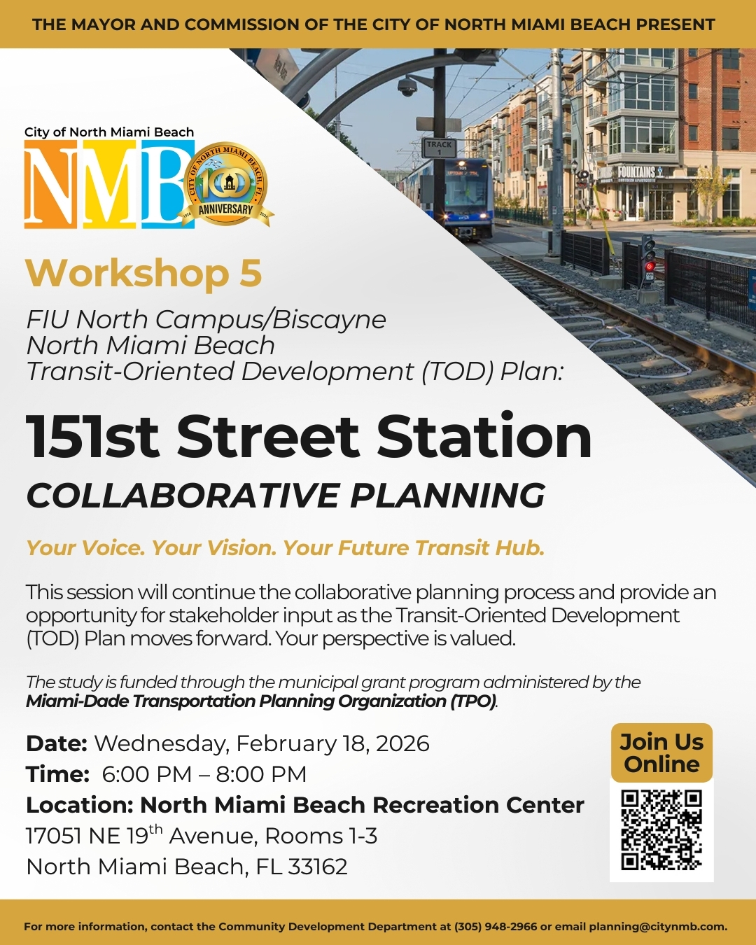 The Mayor and Commission of the City of North Miami Beach invite residents, business owners, stakeholders, and community partners to participate in Workshop 5 of the 151st Street Station Transit-Oriented Development (TOD) Plan.