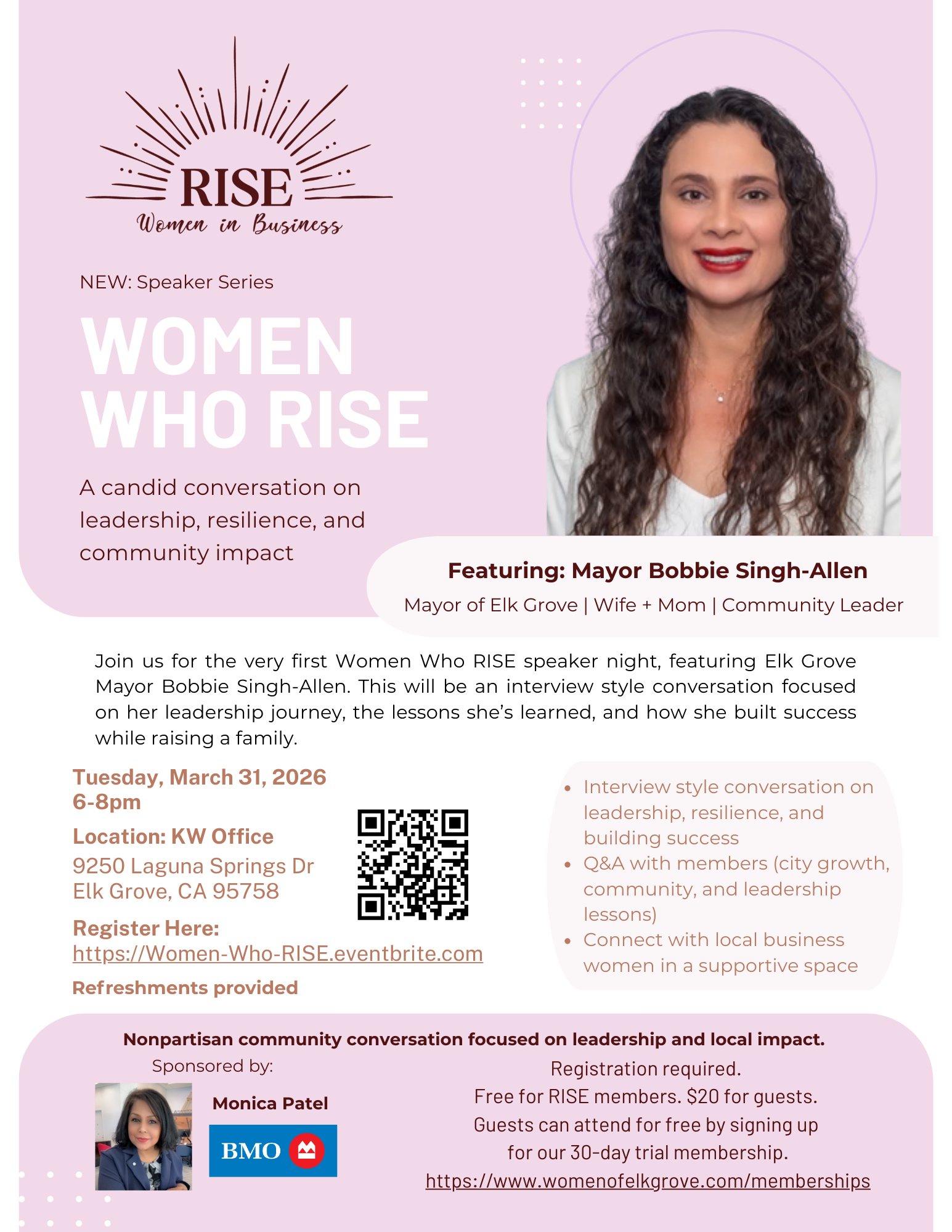 Connect with Elk Grove Mayor Bobbie Singh-Allen and a community of strong, motivated women ready to RISE together. Don’t miss this chance to share stories, ideas, and support in a fun and uplifting atmosphere. Come ready to be inspired and empowered!
