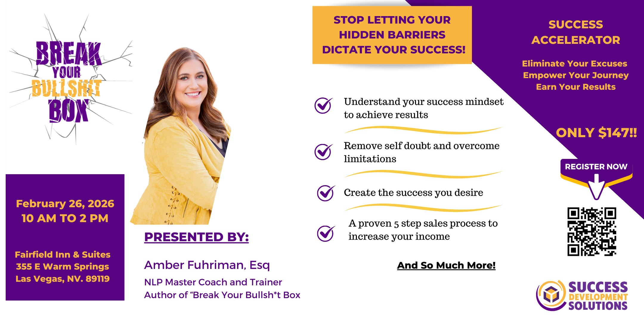 This 4-hour, live Success Accelerator is your no-fluff, no-apologies wake-up call to finally get out of your own damn way. Led by Amber Fuhriman—recovering attorney, Success Architect, and author of Break Your Bullsht Box*—this event is designed to help high-achievers, entrepreneurs, and ambitious professionals like you eliminate internal roadblocks and create tangible, external results.