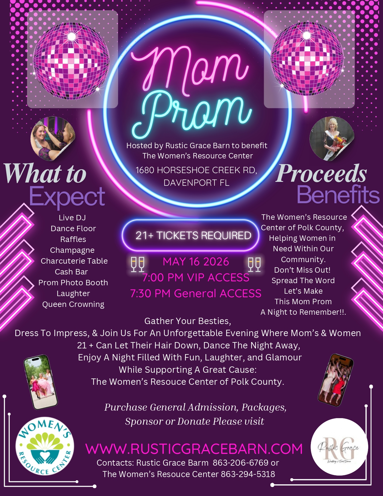 Mom Prom 2026 hosted by Rustic Grace Barn to benefit The Women's Resource Center - Saturday, May 16th- 7:30 p.m. - midnight (7 p.m. VIP Access) - 1680 Horseshoe Creek Rd., Davenport, FL - Dress to Impress & Join Rustic Grace Barn for unforgettable evening while supporting a great cause! Packages available from $50. Visit https://rusticgracebarn.com/upcoming-events for tickets and more info. Click HERE for the flyer and more info!