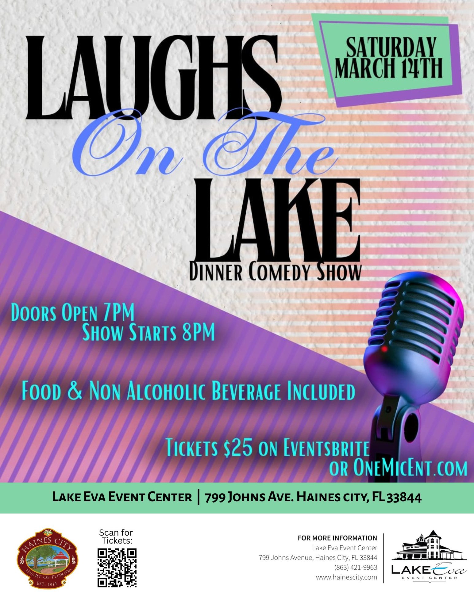 Join the City of Haines City for an evening of laughter and entertainment for Laughs on the Lake, a dinner comedy show at the Lake Eva Event Center, Saturday, March 14th, 799 Johns Ave., Haines City, FL. This will be an unforgettable night that you do not want to miss! For more information contact 863-421- 9963 or Scan the QR code on the flyer to purchase tickets (only $25 per person) - Click HERE or visit https://www.eventbrite.com/e/7th-annual-laughs-on-the-lake-tickets-1982715362021?aff=ebdssbdestsearch