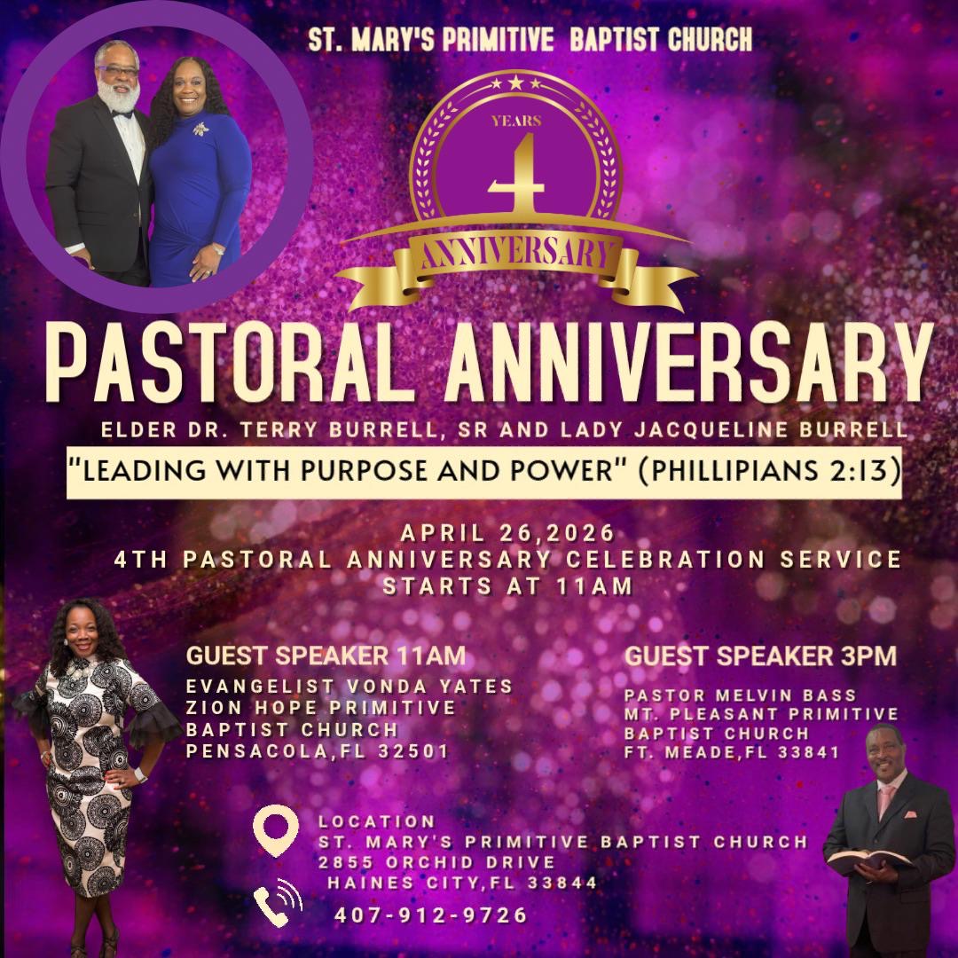 St. Mary's Primitive Baptist Church Pastoral Anniversary - Sunday, April 26th, Beginning at 11 a.m., 2855 Orchid Drive, Haines City, FL. Free Event. Community invited to attend. Click