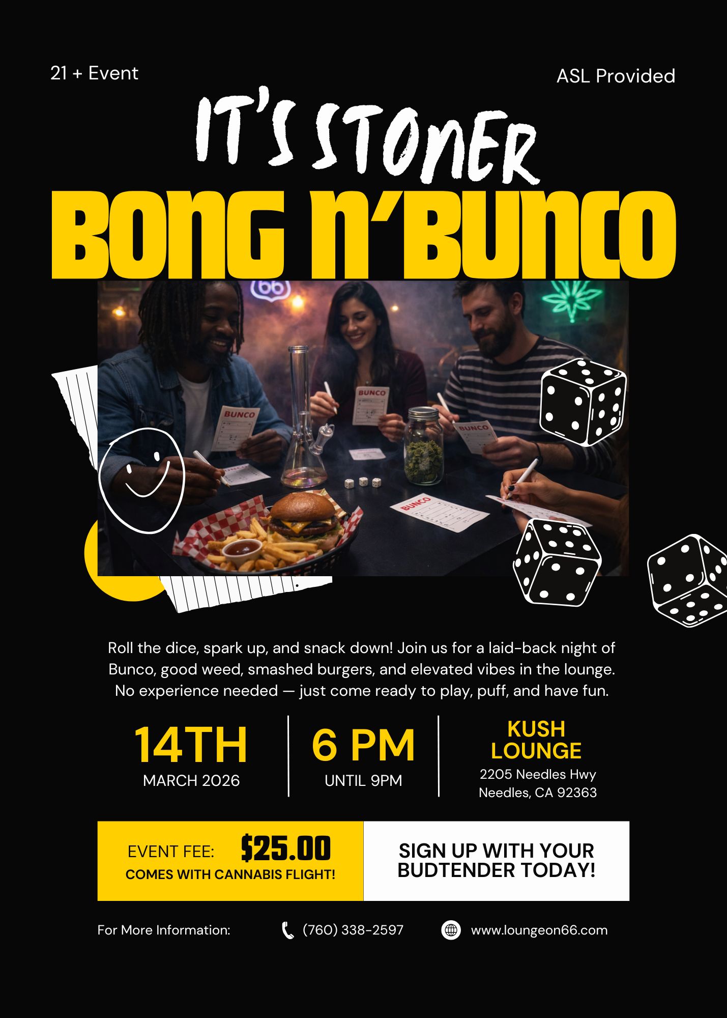 #KushOn66 #BongNBunco #StonerGameNight #ItsAWholeVibe #KushLounge #Route66 #CannabisEvents #ElevateAndUnwind