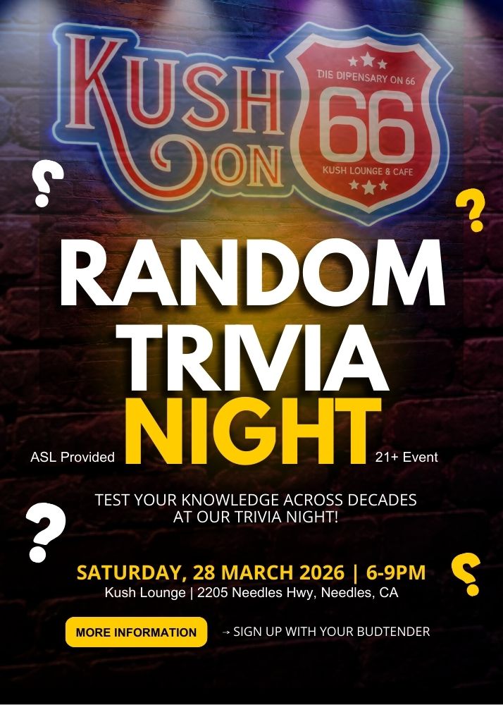 #KushOn66 #TriviaNight #RandomTrivia #KushLounge #ItsAWholeVibe #Route66 #CannabisEvents #GameNight